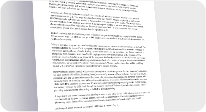 Since that first-generation Echo, customers have purchased more than 100 million Alexa-enabled devices. Last year, we improved Alexa’s ability to understand requests and answer questions by more than 20%, while adding billions of facts to make Alexa more knowledgeable than ever. Developers doubled the number of Alexa skills to over 80,000, and customers spoke to Alexa tens of billions more times in 2018 compared to 2017. The number of devices with Alexa built-in more than doubled in 2018. There are now more than 150 different products available with Alexa built-in, from headphones and PCs to cars and smart home devices. Much more to come! Onelast thing before closing. As I said in the first shareholder letter more than 20 years ago, our focus is on hiring and retaining versatile and talented employees who can think like owners. Achieving that requires investing in our employees, and, as with so many other things at Amazon, we use not just analysis but also intuition and heart to find our way forward. Last year, we raised our minimum wage to $15-an-hour for all full-time, part-time, temporary, and seasonal employees across the U.S. This wage hike benefitted more than 250,000 Amazon employees, as well as over 100,000 seasonal employees who worked at Amazon sites across the country last holiday. We strongly believe that this will benefit our business as we invest in our employees. But that is not what drove the decision. We had always offered competitive wages. But we decided it was time to lead – to offer wages that went beyond competitive. We did it because it seemed like the right thing to do. TodayIchallenge our top retail competitors (you know who you are!) to match our employee benefits and our $15 minimum wage. Do it! Better yet, go to $16 and throw the gauntlet back at us. It’s a kind of competition that will benefit everyone. Manyoftheotherprograms wehaveintroduced for our employees came as much from the heart as the head. I’ve mentioned before the Career Choice program, which pays up to 95% of tuition and fees towards a certificate or diploma in qualified fields of study, leading to in-demand careers for our associates, even if those careers take them away from Amazon. More than 16,000 employees have now taken advantage of the program, which continues to grow. Similarly, our Career Skills program trains hourly associates in critical job skills like resume writing, how to communicate effectively, and computer basics. In October of last year, in continuation of these commitments, we signed the President’s Pledge to America’s Workers and announced we will be upskilling 50,000 U.S. employees through our range of innovative training programs. Ourinvestments are not limited to our current employees or even to the present. To train tomorrow’s workforce, wehavepledged$50million, including through our recently announced Amazon Future Engineer program, to support STEM and CS education around the country for elementary, high school, and university students, with a particular focus on attracting more girls and minorities to these professions. We also continue to take advantage of the incredible talents of our veterans. We are well on our way to meeting our pledge to hire 25,000 veterans and military spouses by 2021. And through the Amazon Technical Veterans Apprenticeship program, we are providing veterans on-the-job training in fields like cloud computing. Ahugethankyoutoourcustomersforallowing us to serve you while always challenging us to do even better, to our shareowners for your continuing support, and to all our employees worldwide for your hard work and pioneering spirit. Teams all across Amazon are listening to customers and wandering on their behalf! Asalways, I attach a copy of our original 1997 letter. It remains Day 1. Sincerely, Jeffrey P. Bezos Founder and Chief Executive Officer Amazon.com, Inc.