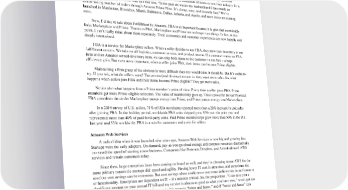 Amazondesignedandmanufactured devices – from Kindle to Fire TV to Echo – also pump energy into Prime services such as Prime Instant Video and Prime Music, and generally drive higher engagement with every element of the Amazon ecosystem. And there’s more to come – our device team has a strong and exciting roadmap ahead. Prime isn’t done improving on its original fast and free shipping promise either. The recently launched Prime Nowoffers Prime members free two-hour delivery on tens of thousands of items or one-hour delivery for a $7.99 fee. Lots of early reviews read like this one, “In the past six weeks my husband and I have made an embarrassing number of orders through Amazon Prime Now. It’s cheap, easy, and insanely fast.” We’ve launched in Manhattan, Brooklyn, Miami, Baltimore, Dallas, Atlanta, and Austin, and more cities are coming soon. Now,I’dlike to talk about Fulfillment by Amazon. FBA is so important because it is glue that inextricably links Marketplace and Prime. Thanks to FBA, Marketplace and Prime are no longer two things. In fact, at this point, I can’t really think about them separately. Their economics and customer experiences are now happily and deeply intertwined. FBAisaservice for Marketplace sellers. When a seller decides to use FBA, they stow their inventory in our fulfillment centers. We take on all logistics, customer service, and product returns. If a customer orders an FBA item and an Amazon owned-inventory item, we can ship both items to the customer in one box – a huge efficiency gain. But even more important, when a seller joins FBA, their items can become Prime eligible. Maintaining a firm grasp of the obvious is more difficult than one would think it should be. But it’s useful to try. If you ask, what do sellers want? The correct (and obvious) answer is: they want more sales. So, what happens when sellers join FBA and their items become Prime eligible? They get more sales. Notice also what happens from a Prime member’s point of view. Every time a seller joins FBA, Prime membersgetmorePrimeeligible selection. The value of membership goes up. This is powerful for our flywheel. FBAcompletes the circle: Marketplace pumps energy into Prime, and Prime pumps energy into Marketplace. In a 2014 survey of U.S. sellers, 71% of FBA merchants reported more than a 20% increase in unit sales after joining FBA. In the holiday period, worldwide FBA units shipped grew 50% over the prior year and represented more than 40% of paid third-party units. Paid Prime memberships grew more than 50% in the U.S. last year and 53% worldwide. FBA is a win for customers and a win for sellers. AmazonWebServices Aradical idea when it was launched nine years ago, Amazon Web Services is now big and growing fast. Startups were the early adopters. On-demand, pay-as-you-go cloud storage and compute resources dramatically increased the speed of starting a new business. Companies like Pinterest, Dropbox, and Airbnb all used AWS services and remain customers today. Since then, large enterprises have been coming on board as well, and they’re choosing to use AWS for the sameprimary reason the startups did: speed and agility. Having lower IT cost is attractive, and sometimes the absolute cost savings can be enormous. But cost savings alone could never overcome deficiencies in performance or functionality. Enterprises are dependent on IT – it’s mission critical. So, the proposition, “I can save you a significant amount on your annual IT bill and my service is almost as good as what you have now,” won’t get too manycustomers. What customers really want in this arena is “better and faster,” and if “better and faster” can comewithasidedishofcost savings, terrific. But the cost savings is the gravy, not the steak. IT is so high leverage. You don’t want to imagine a competitor whose IT department is more nimble than yours. Every company has a list of technology projects that the business would like to see implemented as soon as possible. The painful reality is that tough triage decisions are always made, and many projects never get done. Eventhose that get resourced are often delivered late or with incomplete functionality. If an IT department can figure out how to deliver a larger number of business-enabling technology projects faster, they’ll be creating significant and real value for their organization.