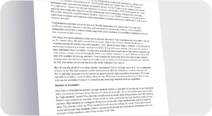 2017 Toourshareowners: th TheAmericanCustomerSatisfaction Index recently announced the results of its annual survey, and for the 8 year in a row customers ranked Amazon #1. The United Kingdom has a similar index, The U.K. Customer th Satisfaction Index, put out by the Institute of Customer Service. For the 5 time in a row Amazon U.K. ranked #1inthat survey. Amazon was also just named the #1 business on LinkedIn’s 2018 Top Companies list, which ranks the most sought after places to work for professionals in the United States. And just a few weeks ago, Harris Poll released its annual Reputation Quotient, which surveys over 25,000 consumers on a broad range of rd topics from workplace environment to social responsibility to products and services, and for the 3 year in a row Amazonranked#1. Congratulations and thank you to the now over 560,000 Amazonians who come to work every day with unrelenting customer obsession, ingenuity, and commitment to operational excellence. And on behalf of Amazonians everywhere, I want to extend a huge thank you to customers. It’s incredibly energizing for us to see your responses to these surveys. Onething I love about customers is that they are divinely discontent. Their expectations are never static – they go up. It’s human nature. We didn’t ascend from our hunter-gatherer days by being satisfied. People have a voracious appetite for a better way, and yesterday’s ‘wow’ quickly becomes today’s ‘ordinary’. I see that cycle of improvement happening at a faster rate than ever before. It may be because customers have such easy access to moreinformation than ever before – in only a few seconds and with a couple taps on their phones, customers can read reviews, compare prices from multiple retailers, see whether something’s in stock, find out how fast it will ship or be available for pick-up, and more. These examples are from retail, but I sense that the same customer empowermentphenomenonishappeningbroadly across everything we do at Amazon and most other industries as well. You cannot rest on your laurels in this world. Customers won’t have it. Howdoyoustayaheadofever-rising customer expectations? There’s no single way to do it – it’s a combination of many things. But high standards (widely deployed and at all levels of detail) are certainly a big part of it. We’vehadsomesuccesses over the years in our quest to meet the high expectations of customers. We’ve also had billions of dollars’ worth of failures along the way. With those experiences as backdrop, I’d like to share with you the essentials of what we’ve learned (so far) about high standards inside an organization. Intrinsic or Teachable? First, there’s a foundational question: are high standards intrinsic or teachable? If you take me on your basketball team, you can teach me many things, but you can’t teach me to be taller. Do we first and foremost need to select for “high standards” people? If so, this letter would need to be mostly about hiring practices, but I don’t think so. I believe high standards are teachable. In fact, people are pretty good at learning high standards simply through exposure. High standards are contagious. Bring a new person onto a high standards team, and they’ll quickly adapt. The opposite is also true. If low standards prevail, those too will quickly spread. And though exposure works well to teach high standards, I believe you can accelerate that rate of learning by articulating a few core principles of high standards, which I hope to share in this letter. Universal or Domain Specific? Another important question is whether high standards are universal or domain specific. In other words, if you have high standards in one area, do you automatically have high standards elsewhere? I believe high standards are domain specific, and that you have to learn high standards separately in every arena of interest. When I started Amazon, I had high standards on inventing, on customer care, and (thankfully) on hiring. But I didn’t have high standards on operational process: how to keep fixed problems fixed, how to eliminate defects at the root, how to inspect processes, and much more. I had to learn and develop high standards on all of that (my colleagues were my tutors).