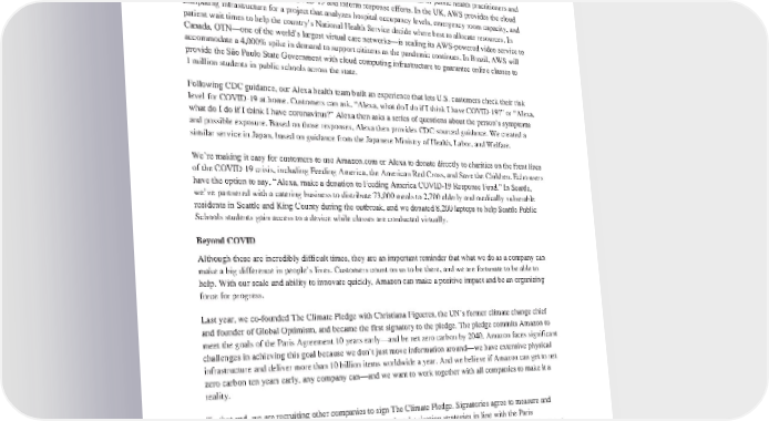 Customers around the world have leveraged the cloud to scale up services and stand up responses to COVID-19. WejoinedtheNewYorkCityCOVID-19RapidResponseCoalitiontodevelopaconversational agent to enable at-risk and elderly New Yorkers to receive accurate, timely information about medical and other important needs. In response to a request from the Los Angeles Unified School District to transition 700,000 students to remote learning, AWS helped establish a call center to field IT questions, provide remote support, and enable staff to answer calls. We are providing cloud services to the CDC to help thousands of public health practitioners and clinicians gather data related to COVID-19 and inform response efforts. In the UK, AWS provides the cloud computing infrastructure for a project that analyzes hospital occupancy levels, emergency room capacity, and patient wait times to help the country’s National Health Service decide where best to allocate resources. In Canada, OTN—oneoftheworld’slargest virtual care networks—is scaling its AWS-powered video service to accommodate a 4,000% spike in demand to support citizens as the pandemic continues. In Brazil, AWS will provide the São Paulo State Government with cloud computing infrastructure to guarantee online classes to 1 million students in public schools across the state. Following CDCguidance, our Alexa health team built an experience that lets U.S. customers check their risk level for COVID-19 at home. Customers can ask, “Alexa, what do I do if I think I have COVID-19?” or “Alexa, what do I do if I think I have coronavirus?” Alexa then asks a series of questions about the person’s symptoms and possible exposure. Based on those responses, Alexa then provides CDC-sourced guidance. We created a similar service in Japan, based on guidance from the Japanese Ministry of Health, Labor, and Welfare. We’re making it easy for customers to use Amazon.com or Alexa to donate directly to charities on the front lines of the COVID-19 crisis, including Feeding America, the American Red Cross, and Save the Children. Echo users have the option to say, “Alexa, make a donation to Feeding America COVID-19 Response Fund.” In Seattle, we’ve partnered with a catering business to distribute 73,000 meals to 2,700 elderly and medically vulnerable residents in Seattle and King County during the outbreak, and we donated 8,200 laptops to help Seattle Public Schools students gain access to a device while classes are conducted virtually. BeyondCOVID Although these are incredibly difficult times, they are an important reminder that what we do as a company can makeabigdifference in people’s lives. Customers count on us to be there, and we are fortunate to be able to help. With our scale and ability to innovate quickly, Amazon can make a positive impact and be an organizing force for progress. Last year, we co-founded The Climate Pledge with Christiana Figueres, the UN’s former climate change chief and founder of Global Optimism, and became the first signatory to the pledge. The pledge commits Amazon to meet the goals of the Paris Agreement 10 years early—and be net zero carbon by 2040. Amazon faces significant challenges in achieving this goal because we don’t just move information around—we have extensive physical infrastructure and deliver more than 10 billion items worldwide a year. And we believe if Amazon can get to net zero carbon ten years early, any company can—and we want to work together with all companies to make it a reality. Tothat end, we are recruiting other companies to sign The Climate Pledge. Signatories agree to measure and report greenhouse gas emissions regularly, implement decarbonization strategies in line with the Paris Agreement, and achieve net zero annual carbon emissions by 2040. (We’ll be announcing new signatories soon.) Weplantomeetthepledge,inpart, by purchasing 100,000 electric delivery vans from Rivian—a Michigan- based producer of electric vehicles. Amazon aims to have 10,000 of Rivian’s new electric vans on the road as early as 2022, and all 100,000 vehicles on the road by 2030. That’s good for the environment, but the promise is even greater. This type of investment sends a signal to the marketplace to start inventing and developing new technologies that large, global companies need to transition to a low-carbon economy.