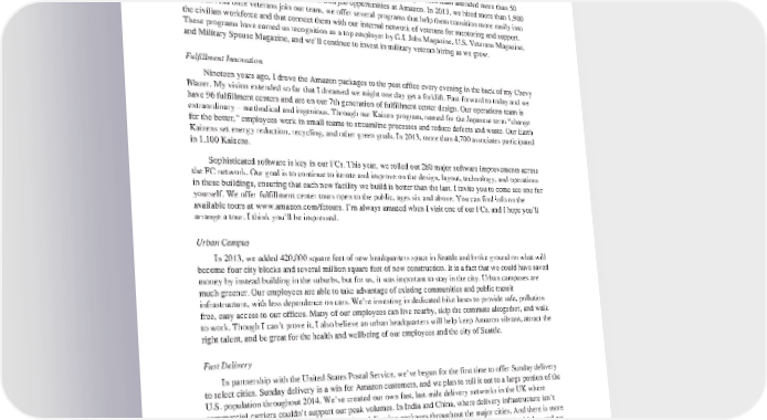 Veteran Hiring Weseekleaders whocaninvent, think big, have a bias for action, and deliver results on behalf of customers. These principles look familiar to men and women who’ve served our country in the armed forces, and we find that their experience leading people is invaluable in our fast-paced work environment. We’re a member of Joining Forces and the 100,000 Jobs Mission – two national efforts that encourage businesses to offer service membersandtheir families career opportunities and support. Our Military Talent team attended more than 50 recruiting events last year to help veterans find job opportunities at Amazon. In 2013, we hired more than 1,900 veterans. And once veterans join our team, we offer several programs that help them transition more easily into the civilian workforce and that connect them with our internal network of veterans for mentoring and support. These programs have earned us recognition as a top employer by G.I. Jobs Magazine, U.S. Veterans Magazine, and Military Spouse Magazine, and we’ll continue to invest in military veteran hiring as we grow. Fulfillment Innovation Nineteen years ago, I drove the Amazon packages to the post office every evening in the back of my Chevy Blazer. My vision extended so far that I dreamed we might one day get a forklift. Fast-forward to today and we have 96 fulfillment centers and are on our 7th generation of fulfillment center design. Our operations team is extraordinary – methodical and ingenious. Through our Kaizen program, named for the Japanese term “change for the better,” employees work in small teams to streamline processes and reduce defects and waste. Our Earth Kaizens set energy reduction, recycling, and other green goals. In 2013, more than 4,700 associates participated in 1,100 Kaizens. Sophisticated software is key in our FCs. This year, we rolled out 280 major software improvements across the FC network. Our goal is to continue to iterate and improve on the design, layout, technology, and operations in these buildings, ensuring that each new facility we build is better than the last. I invite you to come see one for yourself. We offer fulfillment center tours open to the public, ages six and above. You can find info on the available tours at www.amazon.com/fctours. I’m always amazed when I visit one of our FCs, and I hope you’ll arrange a tour. I think you’ll be impressed. UrbanCampus In 2013, we added 420,000 square feet of new headquarters space in Seattle and broke ground on what will becomefour city blocks and several million square feet of new construction. It is a fact that we could have saved moneybyinstead building in the suburbs, but for us, it was important to stay in the city. Urban campuses are muchgreener. Our employees are able to take advantage of existing communities and public transit infrastructure, with less dependence on cars. We’re investing in dedicated bike lanes to provide safe, pollution- free, easy access to our offices. Many of our employees can live nearby, skip the commute altogether, and walk to work. Though I can’t prove it, I also believe an urban headquarters will help keep Amazon vibrant, attract the right talent, and be great for the health and wellbeing of our employees and the city of Seattle. Fast Delivery In partnership with the United States Postal Service, we’ve begun for the first time to offer Sunday delivery to select cities. Sunday delivery is a win for Amazon customers, and we plan to roll it out to a large portion of the U.S. population throughout 2014. We’ve created our own fast, last-mile delivery networks in the UK where commercial carriers couldn’t support our peak volumes. In India and China, where delivery infrastructure isn’t yet mature, you can see Amazon bike couriers delivering packages throughout the major cities. And there is more invention to come. The Prime Air team is already flight testing our 5th and 6th generation aerial vehicles, and we are in the design phase on generations 7 and 8. Experiments and More Experiments Wehaveourowninternal experimentation platform called “Weblab” that we use to evaluate improvements to our websites and products. In 2013, we ran 1,976 Weblabs worldwide, up from 1,092 in 2012, and 546 in 2011. One recent success is our new feature called “Ask an owner”. It was many years ago that we pioneered the