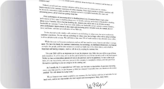 enough financing runway, Pets.com and living.com may have been able to acquire enough customers to achieve the needed scale. But when the capital markets closed the door on financing Internet companies, these companies simply had no choice but to close their doors. As painful as that was, the alternative—investing more of our own capital in these companies to keep them afloat—would have been an even bigger mistake. Future: Real Estate Doesn’t Obey Moore’s Law. Let’s move to the future. Why should you be optimistic about the future of e-commerce and the future of Amazon.com? Industry growth and new customer adoption will be driven over the coming years by relentless improvements in the customer experience of online shopping. These improvements in customer experience will be driven by innovations made possible by dramatic increases in available bandwidth, disk space, and processing power, all of which are getting cheap fast. Price performance of processing power is doubling about every 18 months (Moore’s Law), price performance of disk space is doubling about every 12 months, and price performance of bandwidth is doubling about every 9 months. Given that last doubling rate, Amazon.com will be able to use 60 times as much bandwidth per customer 5 years from now while holding our bandwidth cost per customer constant. Similarly, price performance improvements in disk space and processing power will allow us to, for example, do ever more and better real-time personalization of our Web site. In the physical world, retailers will continue to use technology to reduce costs, but not to transform the customer experience. We too will use technology to reduce costs, but the bigger effect will be using technology to drive adoption and revenue. We still believe that some 15% of retail commerce may ultimately move online. While there are no foregone conclusions, and we still have much to prove, Amazon.com today is a unique asset. We have the brand, the customer relationships, the technology, the fulfillment infrastructure, the financial strength, the people, and the determination to extend our leadership in this infant industry and to build an important and lasting company. And we will do so by keeping the customer first. The year 2001 will be an important one in our development. Like 2000, this year will be a year of focus and execution. As a first step, we’ve set the goal of achieving a pro forma operating profit in the fourth quarter. While we have a tremendous amount of work to do and there can be no guarantees, we have a plan to get there, it’s our top priority, and every person in this company is committed to helping with that goal. I look forward to reporting to you our progress in the coming year. As I usually do, I’ve appended our 1997 letter, our first letter to shareholders. It gets more interesting every year that goes by, in part because so little has changed. I especially draw your attention to the section entitled ‘‘It’s All About the Long Term.’’ Weat Amazon.com remain grateful to our customers for their business and trust, to each other for our hard work, and to our shareholders for their support and encouragement. Many, many thanks. Jeffrey P. Bezos Founder and Chief Executive Officer Amazon.com, Inc.