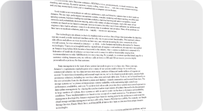 2010 Toourshareowners: Randomforests, naïve Bayesian estimators, RESTful services, gossip protocols, eventual consistency, data sharding, anti-entropy, Byzantine quorum, erasure coding, vector clocks … walk into certain Amazon meetings, and you may momentarily think you’ve stumbled into a computer science lecture. Lookinside a current textbook on software architecture, and you’ll find few patterns that we don’t apply at Amazon.Weusehigh-performance transactions systems, complex rendering and object caching, workflow and queuing systems, business intelligence and data analytics, machine learning and pattern recognition, neural networks and probabilistic decision making, and a wide variety of other techniques. And while many of our systems are based on the latest in computer science research, this often hasn’t been sufficient: our architects and engineers have had to advance research in directions that no academic had yet taken. Many of the problems we face have no textbook solutions, and so we -- happily -- invent new approaches. Ourtechnologies are almost exclusively implemented as services: bits of logic that encapsulate the data they operate on and provide hardened interfaces as the only way to access their functionality. This approach reduces side effects and allows services to evolve at their own pace without impacting the other components of the overall system. Service-oriented architecture -- or SOA -- is the fundamental building abstraction for Amazon technologies. Thanks to a thoughtful and far-sighted team of engineers and architects, this approach was applied at Amazon long before SOA became a buzzword in the industry. Our e-commerce platform is composed of a federation of hundreds of software services that work in concert to deliver functionality ranging from recommendations to order fulfillment to inventory tracking. For example, to construct a product detail page for a customer visiting Amazon.com, our software calls on between 200 and 300 services to present a highly personalized experience for that customer. State management is the heart of any system that needs to grow to very large size. Many years ago, Amazon’srequirements reached a point where many of our systems could no longer be served by any commercial solution: our key data services store many petabytes of data and handle millions of requests per second. To meet these demanding and unusual requirements, we’ve developed several alternative, purpose-built persistence solutions, including our own key-value store and single table store. To do so, we’ve leaned heavily on the core principles from the distributed systems and database research communities and invented from there. The storage systems we’ve pioneered demonstrate extreme scalability while maintaining tight control over performance, availability, and cost. To achieve their ultra-scale properties these systems take a novel approach to data update management: by relaxing the synchronization requirements of updates that need to be disseminated to large numbers of replicas, these systems are able to survive under the harshest performance and availability conditions. These implementations are based on the concept of eventual consistency. The advances in data management developed by Amazon engineers have been the starting point for the architectures underneath the cloud storage and data management services offered by Amazon Web Services (AWS). For example, our Simple Storage Service, Elastic Block Store, and SimpleDB all derive their basic architecture from unique Amazon technologies. Other areas of Amazon’s business face similarly complex data processing and decision problems, such as product data ingestion and categorization, demand forecasting, inventory allocation, and fraud detection. Rule- based systems can be used successfully, but they can be hard to maintain and can become brittle over time. In manycases, advanced machine learning techniques provide more accurate classification and can self-heal to adapt to changing conditions. For example, our search engine employs data mining and machine learning algorithms that run in the background to build topic models, and we apply information extraction algorithms to identify attributes and extract entities from unstructured descriptions, allowing customers to narrow their searches and quickly find the desired product. We consider a large number of factors in search relevance to
