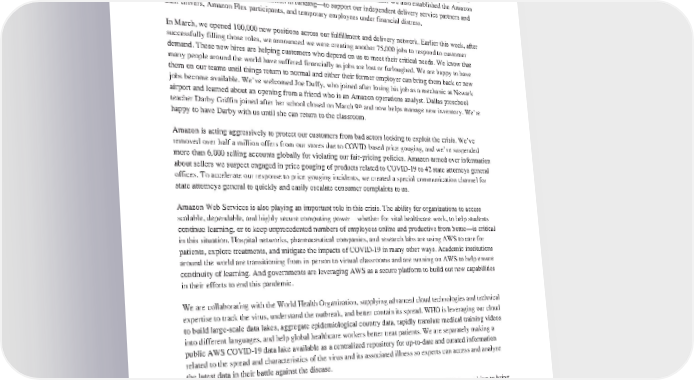 While we explore longer-term solutions, we are also committed to helping support employees now. We increased our minimum wage through the end of April by $2 per hour in the U.S., $2 per hour in Canada, £2 per hour in the UK,and€2perhourinmanyEuropeancountries. Andwearepayingassociates double our regular rate for any overtime worked—a minimum of $34 an hour—an increase from time and a half. These wage increases will cost morethan $500 million, just through the end of April, and likely more than that over time. While we recognize this is expensive, we believe it’s the right thing to do under the circumstances. We also established the Amazon Relief Fund—with an initial $25 million in funding—to support our independent delivery service partners and their drivers, Amazon Flex participants, and temporary employees under financial distress. In March, we opened 100,000 new positions across our fulfillment and delivery network. Earlier this week, after successfully filling those roles, we announced we were creating another 75,000 jobs to respond to customer demand. These new hires are helping customers who depend on us to meet their critical needs. We know that manypeoplearoundtheworldhavesuffered financially as jobs are lost or furloughed. We are happy to have them on our teams until things return to normal and either their former employer can bring them back or new jobs become available. We’ve welcomed Joe Duffy, who joined after losing his job as a mechanic at Newark airport and learned about an opening from a friend who is an Amazon operations analyst. Dallas preschool th teacher Darby Griffin joined after her school closed on March 9 and now helps manage new inventory. We’re happy to have Darby with us until she can return to the classroom. Amazonisacting aggressively to protect our customers from bad actors looking to exploit the crisis. We’ve removed over half a million offers from our stores due to COVID-based price gouging, and we’ve suspended morethan 6,000 selling accounts globally for violating our fair-pricing policies. Amazon turned over information about sellers we suspect engaged in price gouging of products related to COVID-19 to 42 state attorneys general offices. To accelerate our response to price-gouging incidents, we created a special communication channel for state attorneys general to quickly and easily escalate consumer complaints to us. AmazonWebServicesisalsoplaying an important role in this crisis. The ability for organizations to access scalable, dependable, and highly secure computing power—whether for vital healthcare work, to help students continue learning, or to keep unprecedented numbers of employees online and productive from home—is critical in this situation. Hospital networks, pharmaceutical companies, and research labs are using AWS to care for patients, explore treatments, and mitigate the impacts of COVID-19 in many other ways. Academic institutions around the world are transitioning from in-person to virtual classrooms and are running on AWS to help ensure continuity of learning. And governments are leveraging AWS as a secure platform to build out new capabilities in their efforts to end this pandemic. Wearecollaborating with the World Health Organization, supplying advanced cloud technologies and technical expertise to track the virus, understand the outbreak, and better contain its spread. WHO is leveraging our cloud to build large-scale data lakes, aggregate epidemiological country data, rapidly translate medical training videos into different languages, and help global healthcare workers better treat patients. We are separately making a public AWSCOVID-19datalakeavailable as a centralized repository for up-to-date and curated information related to the spread and characteristics of the virus and its associated illness so experts can access and analyze the latest data in their battle against the disease. Wealsolaunched the AWSDiagnostic Development Initiative, a program to support customers working to bring moreaccurate diagnostic solutions to market for COVID-19. Better diagnostics help accelerate treatment and containment of this pandemic. We committed $20 million to accelerate this work and help our customers harness the cloud to tackle this challenge. While the program was established in response to COVID-19, we also are looking toward the future, and we will fund diagnostic research projects that have the potential to blunt future infectious disease outbreaks.