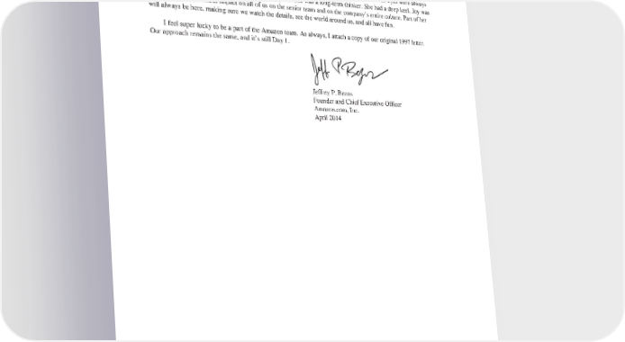 (most experiments can start small), and when we hit on something that is really working for customers, we double-down on it with hopes to turn it into an even bigger success. However, it’s not always as clean as that. Inventing is messy, and over time, it’s certain that we’ll fail at some big bets too. I’d like to close by remembering Joy Covey. Joy was Amazon’s CFO in the early days, and she left an indelible mark on the company. Joy was brilliant, intense, and so fun. She smiled a lot and her eyes were always wide, missing nothing. She was substance over optics. She was a long-term thinker. She had a deep keel. Joy was bold. She had a profound impact on all of us on the senior team and on the company’s entire culture. Part of her will always be here, making sure we watch the details, see the world around us, and all have fun. I feel super lucky to be a part of the Amazon team. As always, I attach a copy of our original 1997 letter. Ourapproach remains the same, and it’s still Day 1. Jeffrey P. Bezos Founder and Chief Executive Officer Amazon.com, Inc. April 2014