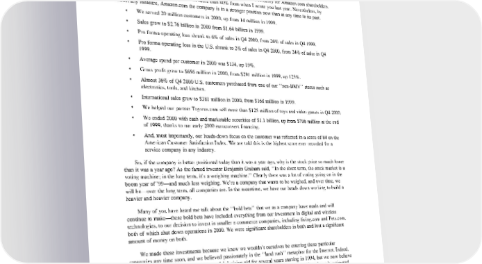 2000 To our shareholders: Ouch. It’s been a brutal year for many in the capital markets and certainly for Amazon.com shareholders. As of this writing, our shares are down more than 80% from when I wrote you last year. Nevertheless, by almost any measure, Amazon.com the company is in a stronger position now than at any time in its past. • Weserved 20 million customers in 2000, up from 14 million in 1999. • Sales grew to $2.76 billion in 2000 from $1.64 billion in 1999. • Pro forma operating loss shrank to 6% of sales in Q4 2000, from 26% of sales in Q4 1999. • Pro forma operating loss in the U.S. shrank to 2% of sales in Q4 2000, from 24% of sales in Q4 1999. • Average spend per customer in 2000 was $134, up 19%. • Gross profit grew to $656 million in 2000, from $291 million in 1999, up 125%. • Almost 36% of Q4 2000 U.S. customers purchased from one of our ‘‘non-BMV’’ stores such as electronics, tools, and kitchen. • International sales grew to $381 million in 2000, from $168 million in 1999. • Wehelped our partner Toysrus.com sell more than $125 million of toys and video games in Q4 2000. • Weended 2000 with cash and marketable securities of $1.1 billion, up from $706 million at the end of 1999, thanks to our early 2000 euroconvert financing. • And, most importantly, our heads-down focus on the customer was reflected in a score of 84 on the American Customer Satisfaction Index. We are told this is the highest score ever recorded for a service company in any industry. So, if the company is better positioned today than it was a year ago, why is the stock price so much lower than it was a year ago? As the famed investor Benjamin Graham said, ‘‘In the short term, the stock market is a voting machine; in the long term, it’s a weighing machine.’’ Clearly there was a lot of voting going on in the boom year of ’99—and much less weighing. We’re a company that wants to be weighed, and over time, we will be—over the long term, all companies are. In the meantime, we have our heads down working to build a heavier and heavier company. Many of you have heard me talk about the ‘‘bold bets’’ that we as a company have made and will continue to make—these bold bets have included everything from our investment in digital and wireless technologies, to our decision to invest in smaller e-commerce companies, including living.com and Pets.com, both of which shut down operations in 2000. We were significant shareholders in both and lost a significant amount of money on both. Wemadethese investments because we knew we wouldn’t ourselves be entering these particular categories any time soon, and we believed passionately in the ‘‘land rush’’ metaphor for the Internet. Indeed, that metaphor was an extraordinarily useful decision aid for several years starting in 1994, but we now believe its usefulness largely faded away over the last couple of years. In retrospect, we significantly underestimated how much time would be available to enter these categories and underestimated how difficult it would be for single-category e-commerce companies to achieve the scale necessary to succeed. Online selling (relative to traditional retailing) is a scale business characterized by high fixed costs and relatively low variable costs. This makes it difficult to be a medium-sized e-commerce company. With a long