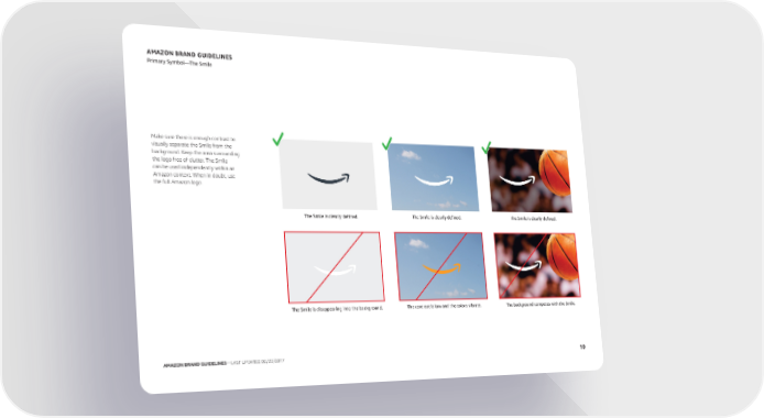 AMAZON BRAND GUIDELINES Primary Symbol—The Smile Make sure there is enough contrast to visually separate the Smile from the background. Keep the area surrounding the logo free of clutter. The Smile can be used independently within an Amazon context. When in doubt, use the full Amazon logo. The Smile is clearly defined. The Smile is clearly defined. The Smile is clearly defined. The Smile is disappearing into the background. The contrast is low and the colors vibrate. The background competes with the Smile. AMAZON BRAND GUIDELINES—LAST UPDATED 02/22/2017 10