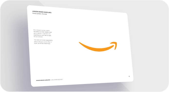 AMAZON BRAND GUIDELINES Primary Symbol—The Smile This is Amazon’s primary symbol. The Smile is our most valuable visual identity element. It represents the experiences we work hard to create for our customers. The Smile can be used independently within an Amazon context. When in doubt, use the full Amazon logo. AMAZON BRAND GUIDELINES—LAST UPDATED 02/22/2017 8