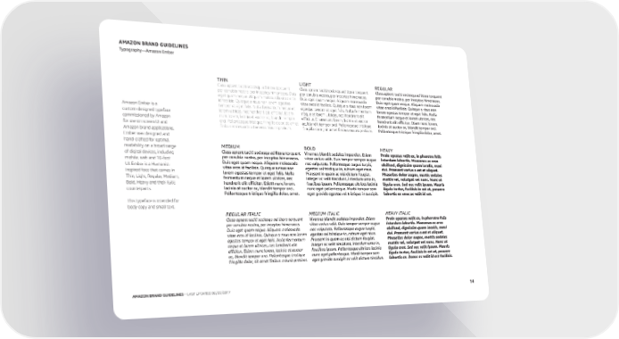 AMAZON BRAND GUIDELINES Typography—Amazon Ember THIN LIGHT REGULAR Class aptent taciti sociosqu ad litora torquent Class aptent taciti sociosqu ad litora torquent Class aptent taciti sociosqu ad litora torquent per conubia nostra, per inceptos himenaeos. Duis per conubia nostra, per inceptos himenaeos. per conubia nostra, per inceptos himenaeos. eget quam neque. Aliquam malesuada vitae eros Duis eget quam neque. Aliquam malesuada Duis eget quam neque. Aliquam malesuada id facilisis. Quisque a risus non lorem egestas vitae eros id facilisis. Quisque a risus non lorem vitae eros id facilisis. Quisque a risus non Amazon Ember is a tempor et eget felis. Nulla fermentum neque et egestas tempor et eget felis. Nulla fermentum lorem egestas tempor et eget felis. Nulla custom-designed typeface lorem ultrices, nec hendrerit elit efficitur. Etiam neque et lorem ultrices, nec hendrerit elit fermentum neque et lorem ultrices, nec commissioned by Amazon nunc lorem, lacinia at auctor ac, blandit tempor efficitur. Etiam nunc lorem, lacinia at auctor hendrerit elit efficitur. Etiam nunc lorem, for use on screen UI and orci. Pellentesque tristique fringilla dolor, sit amet ac, blandit tempor orci. Pellentesque tristique lacinia at auctor ac, blandit tempor orci. Amazon brand applications. finibus malesuada vitae eros mauris pretium. fringilla dolor, sit amet finibus mauris pretium. Pellentesque tristique fringilla dolor, amet. Ember was designed and hand-crafted for optimal readability on a broad range MEDIUM BOLD HEAVY of digital devices, including Class aptent taciti sociosqu ad litora torquent Vivamus blandit sodales imperdiet. Etiam Proin egestas velit ex, in pharetra felis mobile, web and 10-foot per conubia nostra, per inceptos himenaeos. vitae varius velit. Duis tempor semper augue interdum lobortis. Maecenas ac eros UI. Ember is a Humanist- Duis eget quam neque. Aliquam malesuada nec vulputate. Pellentesque augue turpis, eleifend, dignissim quam iaculis, maxi inspired face that comes in vitae eros id facilisis. Quisque a risus non egestas vel tristique in, rutrum eget risus. dui. Praesent varius a est et aliquet. lorem egestas tempor et eget felis. Nulla Praesent in quam ac nisi dictum feugiat. Phasellus dolor augue, mattis sodales Thin, Light, Regular, Medium, fermentum neque et lorem ultrices, nec Integer ac velit tincidunt, interdum urna in, mattis vel, volutpat vel nunc. Nunc ut Bold, Heavy and their Italic hendrerit elit efficitur. Etiam nunc lorem, faucibus ipsum. Pellentesque ultrices lacinia ligula erat. Sed nec velit ipsum. Mauris counterparts. lacinia at auctor ac, blandit tempor orci. nunc eget pellentesque. Morbi tempor sem ligula tortor, facilisis in est at, posuere Pellentesque tristique fringilla dolor, amet. eget gravida egestas vel tristique in suscipit. lobortis ex onec ac velit id est. This typeface is intended for body copy and small text. REGULAR ITALIC MEDIUM ITALIC HEAVY ITALIC Class aptent taciti sociosqu ad litora torquent Vivamus blandit sodales imperdiet. Etiam Proin egestas velit ex, in pharetra felis per conubia nostra, per inceptos himenaeos. vitae varius velit. Duis tempor semper augue interdum lobortis. Maecenas ac eros Duis eget quam neque. Aliquam malesuada nec vulputate. Pellentesque augue turpis, eleifend, dignissim quam iaculis, maxi vitae eros id facilisis. Quisque a risus non lorem egestas vel tristique in, rutrum eget risus. dui. Praesent varius a est et aliquet. egestas tempor et eget felis. Nulla fermentum Praesent in quam ac nisi dictum feugiat. Phasellus dolor augue, mattis sodales neque et lorem ultrices, nec hendrerit elit Integer ac velit tincidunt, interdum urna in, mattis vel, volutpat vel nunc. Nunc ut efficitur. Etiam nunc lorem, lacinia at auctor faucibus ipsum. Pellentesque ultrices lacinia ligula erat. Sed nec velit ipsum. Mauris ac, blandit tempor orci. Pellentesque tristique nunc eget pellentesque. Morbi tempor sem ligula tortor, facilisis in est at, posuere fringilla dolor, sit amet finibus mauris pretium. eget gravida suscipit ac velit dictum tincidun. lobortis ex. Donec ac velit id est facilisis. AMAZON BRAND GUIDELINES—LAST UPDATED 02/22/2017 14