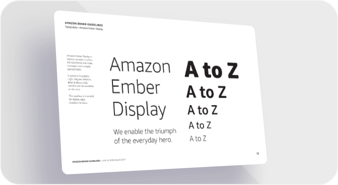 AMAZON BRAND GUIDELINES Typography—Amazon Ember Display Amazon Ember Display is slightly rounded to soften the letterforms and make messages more visually Amazon approachable. A to Z It comes in 5 weights: Light, Regular, Medium, Bold, & Heavy. Italic versions are not available at this time. Ember A to Z This typeface is intended for display copy, headlines & logos. Display A to Z We enable the triumph A to Z of the everyday hero. A to Z AMAZON BRAND GUIDELINES—LAST UPDATED 02/22/2017 12