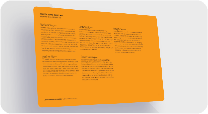 AMAZON BRAND GUIDELINES Key Brand Traits—Who We Are Welcoming— Optimistic— Delightful— We make every customer, everywhere, feel like we create We emphasize expansion and possibility, rather than In everything we create, we find memorable ways to make Amazon just for them. We speak to the customer casually limitations and prohibitions. We’re excited about the future the customer smile. We create experiences that are fun, and directly as if we were having a conversation in person. we’re helping to create, and we express this optimism to the frictionless, and beautiful. We believe that simplicity is the We’re a good listener, looking for ways to be helpful and customer in everything from our color palettes and language greatest delighter of all, but simplicity alone isn’t enough. reassuring, but recognizing when it’s better to remain quiet. choices, to our photography and TV commercials. We’re bright We’re always looking for one more way to make each We’re compassionate and remember that the customer is and open, not cool and sleek. We don’t tell the customer experience a little less ordinary, whether that be a quirky sometimes shopping in a second language, is sometimes sight what they can’t do, we offer solutions and help the customer image in a gateway ad or a hint of unexpected humor in a impaired, and always has a different perspective than we do. discover new options. This sense of boundless possibility UI message. It’s about making that extra little effort every We keep it simple and don’t ask the customer to understand makes the customer feel like Amazon is always the right place time, because we aren’t just building a series of online how Amazon works or to learn our terminology, because to start, whatever their needs. transactions—we’re creating a place for amusement, everything we do is about putting the customer at ease. entertainment, and human connection. Authentic— Empowering— We amplify the truth and let it speak for itself. We work We transform the impossible into the expected. We’re backwards from real customer problems, so we don’t need constantly inventing on behalf of the customer to reduce to make exaggerated claims. We look for opportunities to friction and make life more simple. From eReaders to Echo, relay genuine customer stories and to show people as they from Dash Buttons to Drones, sometimes we’re at our best really are—our customers don’t live in a stock photo world, when we raise the bar so high that the customer isn’t even and we shouldn’t portray them as such. We don’t talk about sure it’s for real. But often our greatest innovations feel like ourselves. We stay focused on the customer, and on the they’ve been there all along, like a 1-Click button or free things our creations help the customer to achieve. same-day shipping. It’s nice when the customer admires our inventions, but we’re most happy when our inventions disappear into the everyday. AMAZON BRAND GUIDELINES—LAST UPDATED 02/22/2017 4