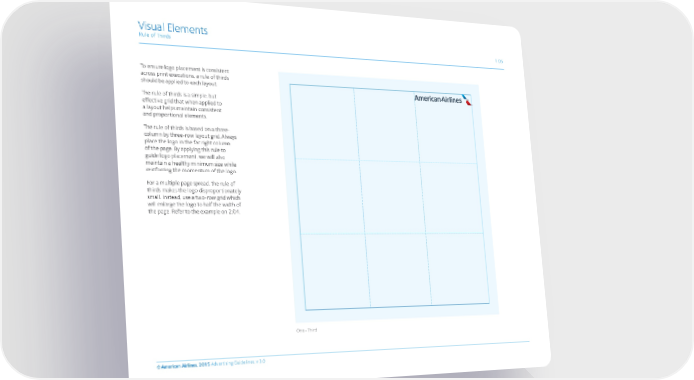 Visual Elements Rule of Thirds 1.05 To ensure logo placement is consistent across print executions, a rule of thirds should be applied to each layout. The rule of thirds is a simple, but effective grid that when applied to a layout helps maintain consistent and proportional elements. The rule of thirds is based on a three- column by three-row layout grid. Always place the logo in the far right column of the page. By applying this rule to guide logo placement, we will also maintain a healthy minimum size while reinforcing the momentum of the logo. For a multiple page spread, the rule of thirds makes the logo disproportionately small. Instead, use a two-row grid which will enlarge the logo to half the width of the page. Refer to the example on 2.04. One – Third © American Airlines, 2015 Advertising Guidelines, v 3.0