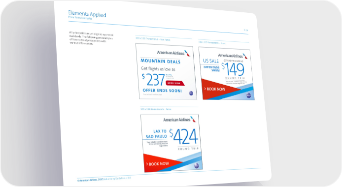 Elements Applied Price Point Examples 2.26 All price points must align to approved 300 x 250 Transactional – Non-Panes 300 x 250 Transactional – Panes standards. The following are examples of how to treat price points with various information. 300 x 250 Route Launch – Panes © American Airlines, 2015 Advertising Guidelines, v 3.0