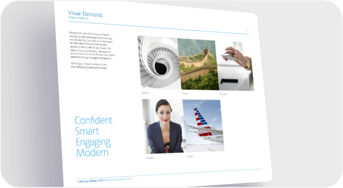 Visual Elements Image Categories 1.32 Imagery is one of the key elements we use to demonstrate the American brand identity. So care must be taken in choosing how we portray the destinations to which we travel, the faces of our customers, the beauty and scale of our aircraft and the subtle interiors of our lounges and planes. All images should demonstrate the following brand attributes: Details Places Journey Confident Smart Engaging Modern People Livery © American Airlines, 2015 Advertising Guidelines, v 3.0