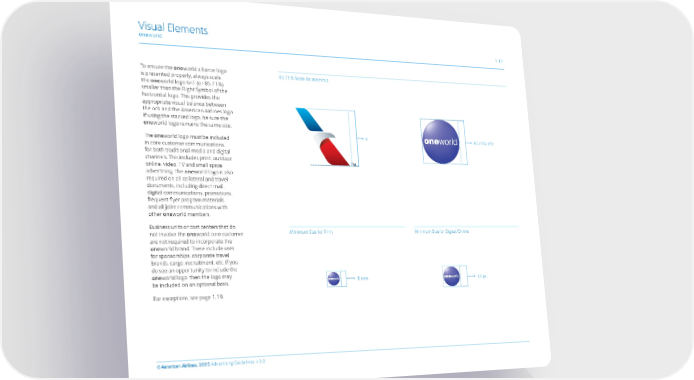 Visual Elements oneworld 1.17 To ensure the oneworld alliance logo 85.71% Scale Relationship is presented properly, always scale the oneworld logo 6/7 (or 85.71%) smaller than the Flight Symbol of the horizontal logo. This provides the appropriate visual balance between the orb and the American Airlines logo. If using the stacked logo, be sure the oneworld logo remains the same size. The oneworld logo must be included X 85.71% of X in core customer communications, for both traditional media and digital channels. This includes print, outdoor, online, video, TV and small space advertising. The oneworld logo is also required on all collateral and travel documents, including direct mail, digital communications, promotions, frequent flyer program materials, and all joint communications with other oneworld members. Business units or cost centers that do not involve the oneworld core customer Minimum Size for Print Minimum Size for Digital/Online are not required to incorporate the oneworld brand. These include uses for sponsorships, corporate travel brands, cargo, recruitment, etc. If you do see an opportunity to include the oneworld logo, then the logo may 8 mm. be included on an optional basis. 35 px.. For exceptions, see page 1.19. © American Airlines, 2015 Advertising Guidelines, v 3.0