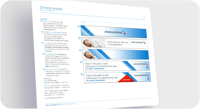 Elements Applied Panes Online Banners 2.18 Animation: 728 x 90 Global Intro The American logo should not be moved from set template position. The logo transitions off along with the panes during the opening animation. Animation and Messaging This is the most flexible sequence of the design, allowing for unique imagery, messaging and animations. The American logo is revealed, set in place. Full Transition In this sequence, the panes fill the entire frame, clear the messaging and then retreat, revealing final messaging and the American logo set in place. Final Messaging In this sequence, additional messaging, and/or blue subhead messaging, when applicable, fades in. The panes transition in partially (about a quarter) up the frame. The bottom pane will have the oneworld logo on it. 5 End -Frame and CTA The red CTA button to slide on screen. The red CTA button has an initial shine animation and grows on hover. Messaging: Copy AA Dark Grey American Sans Regular –20 pt/22 pt Subhead AA Blue with +10 tracking American Sans Medium – 19 pt/21 pt Button Always red, and will expand upon hover; should not be more than 10 – 12 characters. Logo Present on all frames. © American Airlines, 2015 Advertising Guidelines, v 3.0