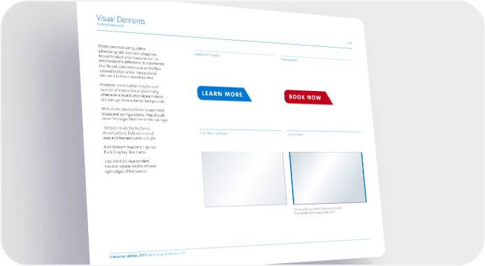 Visual Elements Online Elements 1.28 When communicating online, Brand and Product Transactional advertising falls into two categories: Brand/Product and Transactional. To emphasize this difference, it is preferred that Brand statements use an AA Blue colored button while Transactional ads use a button colored AA Red. However, a red button may be used outside of transactional advertising whenever a blue button doesn't stand out enough from a darker background. All buttons must conform to approved shape and configurations. They should never be longer than the American logo. The type inside the button is AmericanSans Bold set in small 1 px. Key- line Stroke 3 px. Borders caps and tracked out to +75 pts. Web banners require a 1 px. AA Dark Gray key-line frame. 3 px, solid AA Blue borders. can also appear on the left and right edges of the banner. Do not add a gradient to the blue borders. Blue borders are always a flat color. © American Airlines, 2015 Advertising Guidelines, v 3.0