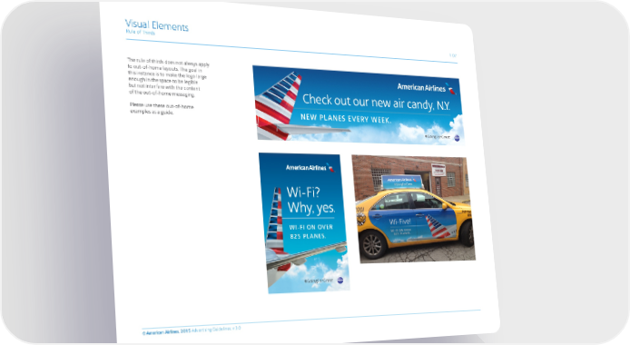 Visual Elements Rule of Thirds 1.07 The rule of thirds does not always apply to out-of-home layouts. The goal in this instance is to make the logo large enough in the space to be legible but not interfere with the content of the out-of-home messaging. Check out our new air candy, N.Y. Please use these out-of-home NEW PLANES EVERY WEEK. examples as a guide. #GoingForGreat Wi-Fi? Why, yes. WI-FI ON OVER 825 PLANES. #GoingForGreat © American Airlines, 2015 Advertising Guidelines, v 3.0