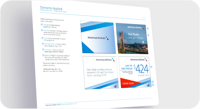 Elements Applied Online Price Point – Route Launch Panes 2.25 Online advertising with price points uses six elements. The logo is present at the beginning of the ad. Headlines are set in AA Dark Gray or white with AmericanSans Medium, AA Blue or white callouts. The image is open and has space for typography. Price point lockup is discussed in more detail on page 1.26. The button fades in after the body copy in the final frame. oneworld logo is aligned according to the American logotype and Flight Symbol and fades in with the button. The button fades in after the body copy in the final frame All banners require a 1 px. AA Dark Gray key-line stroke. © American Airlines, 2015 Advertising Guidelines, v 3.0