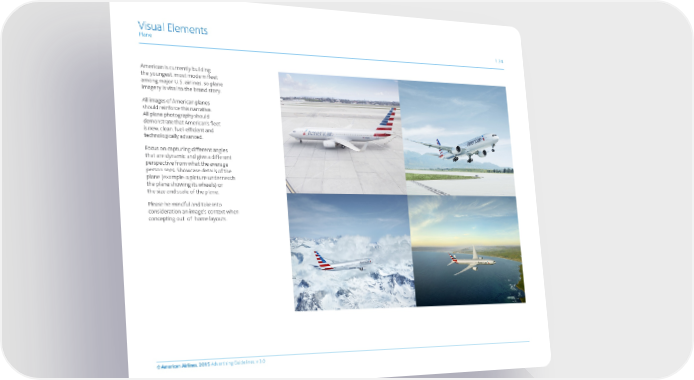 Visual Elements Plane 1.34 American is currently building the youngest, most modern fleet among major U.S. airlines, so plane imagery is vital to the brand story. All images of American planes should reinforce this narrative. All plane photography should demonstrate that American’s fleet is new, clean, fuel - efficient and technologically advanced. Focus on capturing different angles that are dynamic and give a different perspective from what the average person sees. Showcase details of the plane (example: a picture underneath the plane showing its wheels) or the size and scale of the plane. Please be mindful and take into consideration an image's context when concepting out - of - home layouts. © American Airlines, 2015 Advertising Guidelines, v 3.0