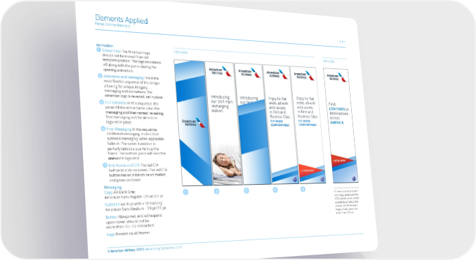 Elements Applied Panes Online Banners 2.17 Animation: 160 x 600 160 x 600 Global Intro The American logo should not be moved from set template position. The logo transitions off along with the panes during the opening animation. Animation and Messaging This is the most flexible sequence of the design, allowing for unique imagery, messaging and animations. The American logo is revealed, set in place. Full Transition In this sequence, the panes fill the entire frame, clear the messaging and then retreat, revealing final messaging and the American logo set in place. Final Messaging In this sequence, additional messaging, and/or blue subhead messaging, when applicable, fades in. The panes transition in partially (about a quarter) up the frame. The bottom pane will have the oneworld logo on it. 5 End-Frame and CTA The red CTA button to slide on screen. The red CTA button has an initial shine animation and grows on hover. Messaging: Copy AA Dark Grey American Sans Regular –20 pt/22 pt If there is an ad unit with Subhead AA Blue with +10 tracking little copy, panes and the CTA button can be raised American Sans Medium – 19 pt/21 pt up slightly to reduce the Button Always red, and will expand amount of white space. Panes should never be upon hover; should not be taller than 150 px. more than 10 – 12 characters. Logo Present on all frames. © American Airlines, 2015 Advertising Guidelines, v 3.0