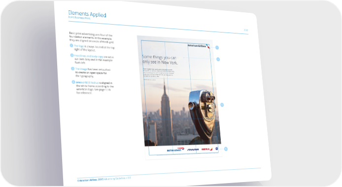 Elements Applied Joint Business Print 2.02 Basic print advertising uses four of the foundation elements. In this example, they are aligned on a rule of thirds grid. The logo is always located at the top right of the layout. Headlines and body copy are set in Some things you can AA Dark Gray and in this example only see in New York. flush left. Now, it’s easier than ever to see America for yourself. The image has been retouched Along with our partners, Iberia and British Airways, we fly direct to many great cities throughout the U.S. And with to create an open space for daily, direct service to New York, we can help you find the typography. he best the city has to offer. Book now on aa.com oneworld JB lockup is aligned in the white frame according to the American logo. See page 1.18 for reference. American Airlines, aa.com and the Flight Symbol logo are marks of American Airlines, Inc. oneworld is a mark of the oneworld Alliance, LLC. © 2013 American Airlines, Inc. All rights reserved. © American Airlines, 2015 Advertising Guidelines, v 3.0
