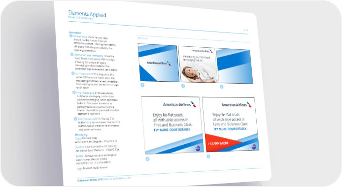 Elements Applied Panes Online Banners 2.16 Animation: 300 x 250 Global Intro The American logo should not be moved from set template position. The logo transitions off along with the panes during the opening animation. Animation and Messaging This is the most flexible sequence of the design, allowing for unique imagery, messaging and animations. The American logo is revealed, set in place. Full Transition In this sequence, the panes fill the entire frame, clear the messaging and then retreat, revealing final messaging and the American logo set in place. Final Messaging In this sequence, additional messaging, and/or blue subhead messaging, when applicable, fades in. The panes transition in partially (about a quarter) up the frame. The bottom pane will have the oneworld logo on it. 5 End -Frame and CTA The red CTA button to slide on screen. The red CTA button has an initial shine animation and grows on hover. Messaging: Copy AA Dark Grey American Sans Regular –20 pt/22 pt Subhead AA Blue with +10 tracking American Sans Medium – 19 pt/21 pt Button Always red, and will expand upon hover; should not be more than 10 – 12 characters. Logo Present on all frames. © American Airlines, 2015 Advertising Guidelines, v 3.0