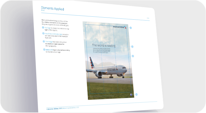 Elements Applied Print 2.01 Basic print advertising uses four of the foundation elements. In this example, they are aligned on a rule of thirds grid. The logo is always located at the top right of the layout. Headlines and body copy are set in AA Dark Gray and in this example flush left. The image has been retouched to create an open space for The world is waiting. the typography. Wherever in the world you wish to explore, oneworld logo is aligned according we can help take you there. We’re bringing you more destinations to make the world to the American logo. feel smaller so you can dream bigger. American Airlines, the Flight Symbol logo and the Tail Symbol are marks of American Airlines, Inc. oneworld is a mark of the oneworld alliance, LLC. © 2014 American Airlines, Inc. All rights reserved. © American Airlines, 2015 Advertising Guidelines, v 3.0