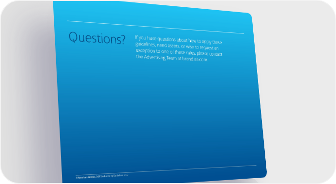 Questions? If you have questions about how to apply these guidelines, need assets, or wish to request an exception to one of these rules, please contact the Advertising Team at brand.aa.com. © American Airlines, 2015 Advertising Guidelines, v.3.0