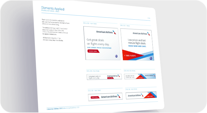 Elements Applied Mobile and Tablet – Static 2.15 Static units for mobile and tablet 300 x 250 – Non-Panes 300 x 250 – Panes ads use the fundamental elements from other online advertising. The oneworld logo and 15 px border does not apply in the 320 x 48, 216 x 36 and smaller sized units due to space limitations. All banners require a 1 px. Get great deals AA Dark Gray key-line stroke. on flights every day. our lowest prices guaranteed book now 320 x 48 – Non-Panes 320 x 48 – Non-Panes Get great deals on flights every day. book now 216 x 36 – Non-Panes 216 x 36 – Non-Panes book now © American Airlines, 2015 Advertising Guidelines, v 3.0
