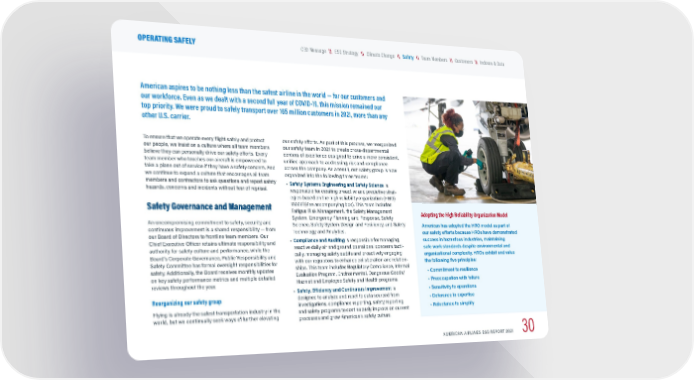 American aspires to be nothing less than the safest airline in the world — for our customers and our workforce. Even as we dealt with a second full year of COVID-19, this mission remained our top priority. We were proud to safely transport over 165 million customers in 2021, more than any other U.S. carrier. To ensure that we operate every flight safely and protect our people, we insist on a culture where all team members believe they can personally drive our safety efforts. Every team member who touches our aircraft is empowered to take a plane out of service if they have a safety concern. And we continue to expand a culture that encourages all team members and contractors to ask questions and report safety hazards, concerns and incidents without fear of reprisal. Safety Governance and Management An uncompromising commitment to safety, security and continuous improvement is a shared responsibility — from our Board of Directors to frontline team members. Our Chief Executive Officer retains ultimate responsibility and authority for safety culture and performance, while the Board’s Corporate Governance, Public Responsibility and Safety Committee has formal oversight responsibilities for safety. Additionally, the Board receives monthly updates on key safety performance metrics and multiple detailed reviews throughout the year. Reorganizing our safety group Flying is already the safest transportation industry in the world, but we continually seek ways of further elevating our safety efforts. As part of this process, we reorganized our safety team in 2021 to create cross-departmental centers of excellence designed to drive a more consistent, unified approach to addressing risk and compliance across the company. As a result, our safety group is now organized into the following three teams: • Safety Systems Engineering and Safety Science is responsible for creating proactive and predictive strat - egies based on the high reliability organization (HRO) model (see accompanying box). This team includes Fatigue Risk Management, the Safety Management System, Emergency Planning and Response, Safety Science, Safety System Design and Resiliency, and Safety Technology and Analytics. • Compliance and Auditing is responsible for managing reactive daily air and ground operational concerns tacti - cally, managing safety audits and proactively engaging with our regulators to enhance collaboration and relation - ships. This team includes Regulatory Compliance, Internal Evaluation Program, Environmental, Dangerous Goods/ Hazmat and Employee Safety and Health programs. • Safety, Efficiency and Continuous Improvement is designed to analyze and react to data sourced from investigations, compliance reporting, safety reporting and safety programs to continuously improve on current processes and grow American’s safety culture. Adopting the High Reliability Organization Model American has adopted the HRO model as part of our safety efforts because HROs have demonstrated success in hazardous industries, maintaining safe work standards despite environmental and organizational complexity. HROs exhibit and value the following five principles: ◆ Commitment to resilience ◆ Preoccupation with failure ◆ Sensitivity to operations ◆ Deference to expertise ◆ Reluctance to simplify AMERICAN AIRLINES ESG REPORT 2021 30 \\ Indexes & Data \\ Customers \\ Team Members \\ Climate Change \\ ESG Strategy CEO Message OPERATING SAFELY \\ Safety