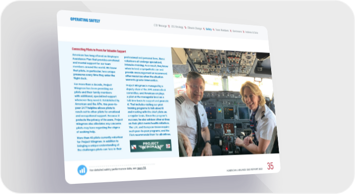 Connecting Pilots to Peers for Valuable Support American has long offered an Employee Assistance Plan that provides emotional and mental support for our team members around the world. We know that pilots, in particular, face unique pressures every time they enter the flight deck. For more than a decade, Project Wingman has been providing our pilots and their family members with additional, specialized support whenever they need it. Established by American and the APA, this peer-to- peer 24/7 helpline allows pilots to reach out to other pilots for emotional and occupational support. Because it protects the privacy of its users, Project Wingman also alleviates any concerns pilots may have regarding the stigma of seeking help. More than 40 pilots currently volunteer for Project Wingman. In addition to bringing a unique understanding of the challenges pilots can face in their professional and personal lives, these volunteers all undergo specialized, intensive training. As a result, they know when to lend a sympathetic ear and provide encouragement or recommend other resources when the situation warrants greater intervention. Project Wingman is managed by a deputy chair of the APA aeromedical committee, and American employs a pilot at the managerial level on a full-time basis to support and promote it. That includes visiting our pilot training programs to talk about it and meeting with the chief pilots on a regular basis. Given the program’s success, he also advises other airlines on their pilot mental health initiatives. The U.K. and European Union require such peer-to-peer programs, and the FAA recommends them for all airlines. For detailed safety performance data, see page 58 . AMERICAN AIRLINES ESG REPORT 2021 35 \\ Indexes & Data \\ Customers \\ Team Members \\ Climate Change \\ ESG Strategy CEO Message OPERATING SAFELY \\ Safety