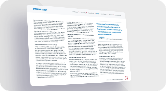 Service, Dispatch, Technical Operations and Central Load Planning teams, giving us significantly greater coverage than the industry average. In 2021, we recorded 10,847 ASAP reports. We expect to roll out programs in 2022 for Gate Agent and Crew Scheduling teams, which will give us ASAP coverage across 100% of our operations. Our GSAP for Fleet Service and Cargo teams plays the same role, encouraging team members to report potential safety issues in cargo and catering environments, control centers and on the ramp. This program was created in collaboration with the Transport Workers Union of America–International Association of Machinists & Aerospace Workers and the FAA. In 2021, we recorded 487 GSAP reports. Flight Operations Quality Assurance (FOQA) FOQA is a voluntary safety program administered jointly by American and the Allied Pilots Association (APA) that uses routinely recorded flight data to proactively identify and correct deficiencies in flight operations. We routinely monitor approximately 90% of our flights and use algorithms to look for potential safety risks. The results help us better understand pilot performance and the operating environment. They also allow us to monitor aircraft systems, performance and operational efficiency. To enhance FOQA’s effectiveness, American partnered with Collins Aerospace in 2021 to retrofit our narrowbody aircraft with its Aircraft Interface Device (AID). The entire fleet at American will be equipped with this wireless data transfer system by the end of 2024. AID improves the speed with which we can retrieve FOQA data, and it represents an important step toward increasing accuracy in monthly reporting, improving aircraft reliability and preparing for future products and capabilities. American will also be the first carrier in the United States to adopt CEFA Aviation Mobile Services, a cloud-based application that allows pilots to recreate their flights on their company iPad. This tool will improve on the concept of crew debriefing by providing real-time feedback to our pilots. It turns each flight into a learning opportunity, ultimately contributing to the safety assurance of our SMS. International Air Transport Association’s Operational Safety Audit (IOSA) As part of our commitment to transparency and monitoring, we are a registered participant in the IOSA program, which is an internationally recognized evaluation system designed to assess an airline’s operational management and control systems. An IOSA, which takes place every two years, creates a structured methodology with standardized checklists that are comparable on a worldwide basis, enabling and maximizing the joint use of audit reports. In April 2022, we successfully completed our IOSA audit in conformance with all standards and recommended practices. As a result, American Airlines IOSA registration has been renewed until July 2024. Line Operations Safety Audits (LOSA) Since launching our continuous pilot LOSA program in 2017, we have been sending highly trained pilot observers onto the flight deck to better understand work-as-done versus work-as-imagined. Observing our frontline team members in action and gathering safety-related data on environmental conditions, operational complexities and crew performance in real time provides us with valuable insights for enhancing safety and resilience. We are expanding LOSA to other work groups outside our pilot group. In 2021, we implemented a continuous Dispatch LOSA and are collecting data to enhance safety performance. We also are developing a Cabin LOSA program and expect to start conducting observations in 2023. The Cabin LOSA program will help us better understand the challenges facing our flight attendants and the measures we can take to keep the cabin safe for everyone. We will continue to evaluate the feasibility of expanding LOSA to other operational groups, with 100% coverage as our ultimate goal. Learning and Improvement Team (LIT) We created LIT in 2022 to collect and analyze data on what makes our pilots successful in their everyday work. LIT is composed of line pilots who are specially trained in flight deck observations and facilitated discussions. While it is similar in some ways to LOSA, LIT is a separate program. One of the key differences between LIT and American’s other Flight SMS programs (i.e., ASAP, FOQA, LOSA) is that LIT focuses on what goes well and why, thus providing a new safety lens through which to view the operation. Combining LIT data with other SMS data provides American with a broader picture of the system, rather than looking solely at unwanted outcomes. “ The Learning and Improvement Team is the latest addition to our Flight SMS programs. By focusing on what we do well, it complements the programs that concentrate primarily on areas where we need to improve.” — Bobbi Wells Vice President, Safety Systems, Efficiency and Compliance AMERICAN AIRLINES ESG REPORT 2021 33 \\ Indexes & Data \\ Customers \\ Team Members \\ Climate Change \\ ESG Strategy CEO Message OPERATING SAFELY \\ Safety