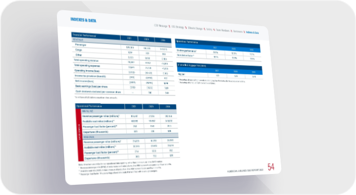 Financial Performance * 2021 2020 2019 REVENUE Passenger $26,063 $14,518 $42,010 Cargo 1,314 769 863 Other 2,505 2,050 2,895 Total operating revenue 29,882 17,337 45,768 Total operating expenses 30,941 27,758 42,703 Operating income (loss) (1,059) (10,421) 3,065 Income tax provision (benefit) (555) (2,568) 570 Net income (loss) (1,993) (8,885) 1,686 Basic earnings (loss) per share (3.09) (18.36) 3.80 Cash dividends declared per common share — 0.10 0.40 * In millions of U.S. dollars, except per-share amounts. Operational Performance 2021 2020 2019 SASB Metrics MAINLINE Revenue passenger miles (millions) * 136,512 77,065 212,859 Available seat miles (millions) ** 182,189 119,567 248,833 Passenger load factor (percent) *** 74.9 64.5 85.5 Departures (thousands) 870 619 1,115 REGIONAL Revenue passenger miles (millions) * 25,026 14,760 28,393 Available seat miles (millions) ** 32,346 23,600 36,255 Passenger load factor (percent) *** 77.4 62.5 78.3 Departures (thousands) 955 720 1,191 Note: American uses miles for our operational data reporting, rather than kilometers, as in the SASB metrics. * Revenue passenger mile (RPM): A basic measure of sales volume. One RPM represents one passenger flown one mile. ** Available seat mile (ASM): A basic measure of production. One ASM represents one seat flown one mile. *** Passenger load factor: The percentage of available seats that are filled with revenue passengers. Operational Performance 2021 2020 2019 On-time performance * 81.6% 82.3% 77.7% Completion factor ** 98.1% 93.9% 97.6% Mishandled Baggage Rate (MBR) 2021 2020 2019 By year 7.63 5.96 8.48 * Percentage of reported flight operations arriving less than 15 minutes after the scheduled arrival time. ** Percentage of scheduled flight operations completed. AMERICAN AIRLINES ESG REPORT 2021 54 \\ Customers \\ Team Members \\ Climate Change \\ Safety \\ ESG Strategy CEO Message INDEXES & DATA \\ Indexes & Data