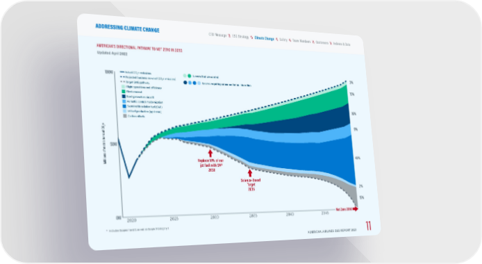 Actual CO 2 e emissions Projected business-as-usual CO 2 e emissions * Target GHG pathway Flight operations and efficiency Fleet renewal Next-generation aircraft Air traffic control modernization Sustainable aviation fuel (SAF) Jet fuel production (upstream) Carbon offsets * Includes Scopes 1 and 2, as well as Scope 3 Category 3 AMERICAN’S DIRECTIONAL PATHWAY TO NET ZERO IN 2050 Updated April 2022 Levers that we control Levers requiring cross-sector collaboration AMERICAN AIRLINES ESG REPORT 2021 11 \\ Indexes & Data \\ Customers \\ Team Members \\ Safety \\ ESG Strategy CEO Message ADDRESSING CLIMATE CHANGE \\ Climate Change