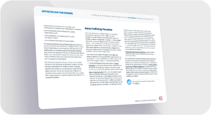 • Organisation for Economic Co-operation and Development’s Guidelines for Multinational Enterprises • Core Conventions of the International Labour Organization (ILO) • ILO’s Declaration on Fundamental Principles and Rights at Work • U.N. Universal Declaration of Human Rights The American Airlines Human Rights Statement applies to all team members and contractors, employees of our wholly owned subsidiaries, and our suppliers and other business relationships. It is formally aligned with global standards, such as the U.N. Guiding Principles on Business and Human Rights. We continuously evaluate our operations and value chain to identify, assess and address human rights risks and to engage key stakeholders. Our statement complements our annual team member training on the Standards of Business Conduct. We also provide a dedicated 24/7 hotline for team members, suppliers and partners to anonymously report human rights concerns. We do not tolerate any retribution or retaliation taken against any individual who has, in good faith, sought advice or reported questionable behavior or a possible violation. Human Trafficking Prevention American has become an industry leader in combating human trafficking and child exploitation. We have mandatory human trafficking awareness training for our frontline, customer-facing team members — including flight attendants, pilots and airport customer service represen - tatives — as well as for team members with international purchasing responsibilities. This training is required for new hires and as part of our recurrent training programs. We know that vigilance is key in fighting the scourge of human trafficking, and we stand ready to help. American’s collaboration with government agencies, industry partners and nongovernmental organizations is a key part of our human trafficking prevention program. We work with a range of partners, including the following: • The U.S. Department of Homeland Security’s Blue Campaign, a national public awareness effort that aims to educate the public, law enforcement and industry partners to recognize the indicators of human trafficking. • New Friends New Life (NFNL), a Dallas-based organi - zation working to restore and empower formerly trafficked teenage girls and sexually exploited women and their children. According to NFNL research, Texas ranks second in the country for trafficking prevalence, with more than 300,000 victims annually statewide. By providing access to education, job training, financial assistance and mental health support, NFNL helps women and their children overcome backgrounds of abuse, addiction, poverty and limited opportunities. NFNL has held training sessions for more than 150 American team members at our headquarters in Fort Worth, Texas, and another 50 at Miami International Airport. The organi - zation honored American in October 2021 as a recipient of its ProtectHER award, which recognized our commitment — in partnership with Jones Day — to helping remove the barrier of a criminal record obtained as a direct result of being trafficked and exploited. • Texas Businesses Against Trafficking , a public–private awareness and prevention initiative led by the Texas Secretary of State. Our Government Contracts Compliance team ensures the company’s compliance with domestic and international modern slavery and human trafficking laws. In July 2021, we published the annual update of American’s Modern Slavery and Human Trafficking Statement to comply with the U.K. Modern Slavery Act of 2015 and Australia’s Modern Slavery Act of 2018. American is also a signatory to ECPAT-USA’s Tourism Child-Protection Code of Conduct , a voluntary set of business principles to prevent child sex tourism and the trafficking of children. For detailed team member diversity data, see page 59 . AMERICAN AIRLINES ESG REPORT ffff 45 \\ Indexes & Data \\ Customers \\ Climate Change \\ Safety \\ ESG Strategy CEO Message SUPPORTING OUR TEAM MEMBERS \\ Team Members