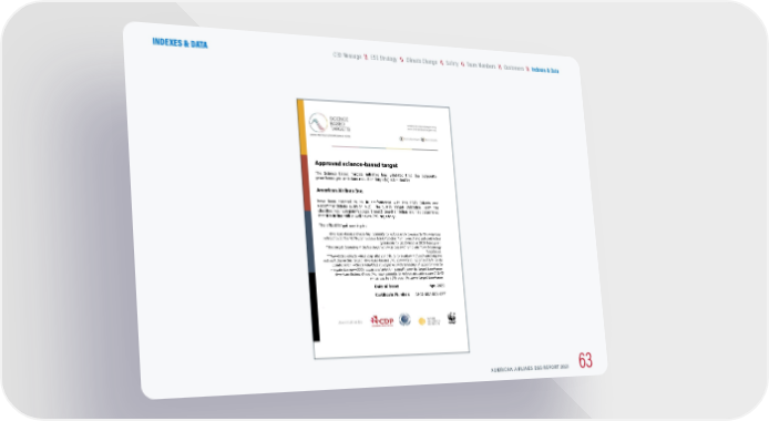 Approved science-based target American Airlines Inc. The official target wording is: Date of issue: Certificate Number: AMAI-USA-001-OFF Apr, 2022 The Science Based Targets initiative has validated that the corporate greenhouse gas emissions reduction target(s) submitted by have been deemed to be in conformance with the SBTi Criteria and Recommendations (version 4.2). The SBTi’s Target Validation Team has classified your company’s scope 1 and 2 target ambition and has determined that it is in line with a well-below 2°C trajectory. American Airlines Group Inc. commits to reduce well-to-wake GHG emissions related to jet fuel 45% per revenue ton kilometer from owned and subcontracted operations by 2035 from a 2019 base year. *The target boundary includes biogenic emissions and removals from bioenergy feedstocks. **Non-CO2e effects which may also contribute to aviation induced warming are not included in this target. American Airlines Inc. commits to report publicly on its collaboration with stakeholders to improve understanding of opportunities to mitigate the non-CO2e impacts of aviation annually over its target timeframe. American Airlines Group Inc. also commits to reduce absolute scope 2 GHG emissions by 40% over the same target timeframe. AMERICAN AIRLINES ESG REPORT 2021 63 \\ Customers \\ Team Members \\ Climate Change \\ Safety \\ ESG Strategy CEO Message INDEXES & DATA \\ Indexes & Data