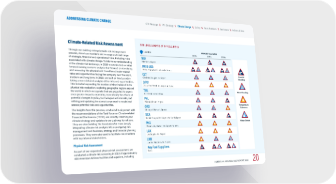 SITE-LEVEL ANALYSIS OF PHYSICAL RISKS Location PRIMARY HAZARDS 2020s 2030s 2050s MIA Miami Int. Airport JFK & LGA JFK Int. Airport and LaGuardia Airport C LT Charlotte Douglas Int. Airport DFW Dallas Fort Worth Int. Airport and area TUL Tulsa Maintenance Base PHL Philadelphia Int. Airport ORD Chicago O’Hare Int. Airport DCA Ronald Reagan Washington National Airport PHX Phoenix Sky Harbor Int. Airport and area LAX Los Angeles Int. Airport LHR London Heathrow Int. Airport Key Fuel Suppliers Texas Climate-Related Risk Assessment Through our existing enterprisewide risk management process, American monitors and manages a broad range of strategic, financial and operational risks, including risks associated with climate change. To inform our understanding of the climate risk landscape, in 2020 we conducted an initial forward-looking scenario analysis that focused on identifying and assessing the physical and transition climate-related risks and opportunities facing the company over the short, medium and long term. In 2022, we built on this by under - taking a more detailed analysis of the risks and opportunities. This included expanding the number of sites included in the physical risk evaluation; exploring geographic regions around the world in which we operate that are projected to experi - ence greater impacts; examining more closely the effects of potential changes in policy, technologies and markets; and refining and updating the scenarios we used to model and assess potential risks and opportunities. The insights from this process, conducted in alignment with the recommendations of the Task Force on Climate-related Financial Disclosures (TCFD), are directly informing our climate strategy and updates to our pathway to net zero. They are also building the foundation for more deeply integrating climate risk analysis into our ongoing risk management and business, strategy and financial planning processes. They were also used to facilitate conversations with key internal stakeholders. Physical Risk Assessment As part of our expanded physical risk assessment, we conducted a climate risk screening in 2022 of approximately 400 American Airlines facilities and suppliers, including Coastal Flooding River Flooding Temperature Extremes Water Stress AMERICAN AIRLINES ESG REPORT 2021 20 \\ Indexes & Data \\ Customers \\ Team Members \\ Safety \\ ESG Strategy CEO Message ADDRESSING CLIMATE CHANGE \\ Climate Change
