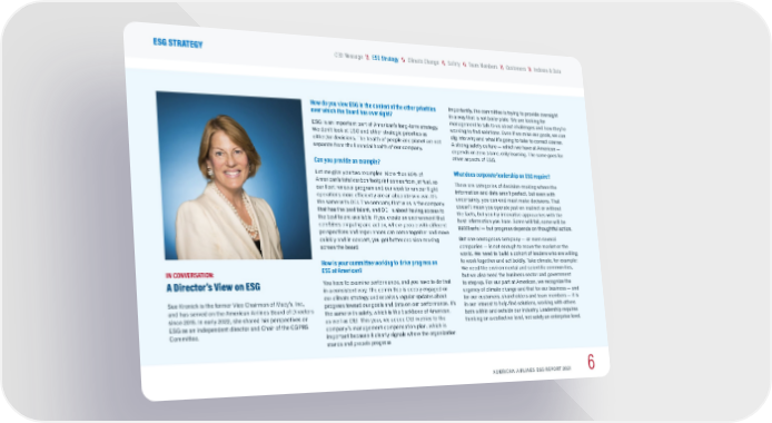 IN CONVERSATION: A Director’s View on ESG Sue Kronick is the former Vice Chairman of Macy’s, Inc., and has served on the American Airlines Board of Directors since 2015. In early 2022, she shared her perspectives on ESG as an independent director and Chair of the CGPRS Committee. How do you view ESG in the context of the other priorities over which the Board has oversight? ESG is an important part of American’s long-term strategy. We don’t look at ESG and other strategic priorities as either/or decisions. The health of people and planet are not separate from the financial health of our company. Can you provide an example? Let me give you two examples. More than 90% of American’s total carbon footprint comes from jet fuel, so our fleet renewal program and our work to run our flight operations more efficiently are an absolute win-win. It’s the same with DEI. The company that wins is the company that has the best talent, and DEI is about having access to the best talent available. If you create an environment that combines empathy and action, where people with different perspectives and experiences can come together and move quickly and in concert, you get better decision-making across the board. How is your committee working to drive progress on ESG at American? You have to examine performance, and you have to do that in a consistent way. The committee is deeply engaged on our climate strategy and receives regular updates about progress toward our goals and data on our performance. It’s the same with safety, which is the backbone of American, as well as DEI. This year, we added DEI metrics to the company’s management compensation plan, which is important because it clearly signals where the organization stands and propels progress. Importantly, the committee is trying to provide oversight in a way that is not boilerplate. We are looking for management to talk to us about challenges and how they’re working to find solutions. Even if we miss our goals, we can dig into why and what it’s going to take to correct course. A strong safety culture — which we have at American — depends on zero blame, only learning. The same goes for other aspects of ESG. What does corporate leadership on ESG require? There are categories of decision-making where the information and data aren’t perfect, but even with uncertainty, you can and must make decisions. That doesn’t mean you operate just on instinct or without the facts, but you try innovative approaches with the best information you have. Some will fail, some will be successful — but progress depends on thoughtful action. But one courageous company — or even several companies — is not enough to move the market or the world. We need to build a cohort of leaders who are willing to work together and act boldly. Take climate, for example: We need the environmental and scientific communities, but we also need the business sector and government to step up. For our part at American, we recognize the urgency of climate change and that for our business — and for our customers, shareholders and team members — it is in our interest to help find solutions, working with others both within and outside our industry. Leadership requires thinking on a collective level, not solely an enterprise level. AMERICAN AIRLINES ESG REPORT 2021 6 \\ Indexes & Data \\ Customers \\ Team Members \\ Climate Change \\ Safety CEO Message \\ ESG Strategy ESG STRATEGY