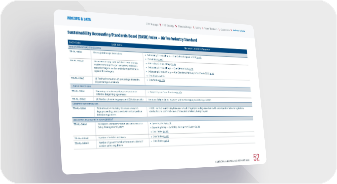 Sustainability Accounting Standards Board (SASB) Index — Airline Industry Standard SASB Code SASB Metric Disclosure Location or Response GREENHOUSE GAS EMISSIONS TR-AL-110a.1 Gross global Scope 1 emissions • Addressing Climate Change — Our Carbon Footprint in 2021 (p. 12) • Data Tables (p. 55) TR-AL-110a.2 Discussion of long-term and short-term strategy or plan to manage Scope 1 emissions, emissions reduction targets, and an analysis of performance against those targets • Addressing Climate Change (p. 8) • Addressing Climate Change — Our Climate Goals (p. 9) • Addressing Climate Change — Our Directional Pathway to Net Zero in 2050 (p. 11) • Data Tables (p. 55) TR-AL-110a.3 (1) Total fuel consumed, (2) percentage alternative, (3) percentage sustainable • Data Tables (p. 56) LABOR PRACTICES TR-AL-310a.1 Percentage of active workforce covered under collective bargaining agreements • Supporting our Team Members (p. 40) TR-AL-310a.2 (1) Number of work stoppages and (2) total days idle American Airlines did not have any union work stoppages or idle days in 2021. COMPETITIVE BEHAVIOR TR-AL-520a.1 Total amount of monetary losses as a result of legal proceedings associated with anticompetitive behavior regulations In 2021, we had no monetary losses as a result of legal proceedings associated with anticompetitive behavior regulations. We also had no confirmed cases of corruption or bribery during the year. ACCIDENT AND SAFETY MANAGEMENT TR-AL-540a.1 Description of implementation and outcomes of a Safety Management System • Operating Safely (p. 29) • Operating Safely — Our Safety Management System (p. 31) • Data Tables (p. 58) TR-AL-540a.2 Number of aviation accidents • Data Tables (p. 58) TR-AL-540a.3 Number of governmental enforcement actions of aviation safety regulations • Data Tables (p. 58) AMERICAN AIRLINES ESG REPORT 2021 52 \\ Customers \\ Team Members \\ Climate Change \\ Safety \\ ESG Strategy CEO Message INDEXES & DATA \\ Indexes & Data