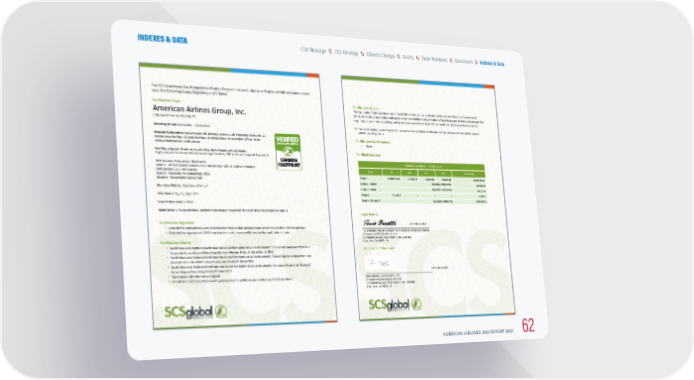 The SCS Greenhouse Gas Footprint Verification Program has conducted a verification of GHG emissions based upon the following Scope, Objectives, and Criteria : Verification Scope American Airlines Group, Inc. 1 Skyview Dr Fort Worth (HQ), TX Reporting Period : 01/01 /2021 – 12 /31/2021 Geographic Boundary: Approximately 150 domestic airports, 100 international airports, 20 maintenance facilities, 15 cargo facilities, 15 vehicle shops, 5 reservation offices, main campus headquarters, credit unions Facilities, physical infrastructure, activities, technologies, and processes: Flights, Airport Terminals, Maintenance/Cargo Facilities, Offices, Ground Support Equipment GHG Sources, Sinks, and/or Reservoirs: Scope 1 - Jet Fuel, Diesel, Gasoline, LPG, Natural Gas, Fuel Oil, Fugitive Emissions (Refrigerants, CO2, Other Gases) Scope 2 - Electricity, Purchased Heat, RECs Biogenic – Sustainable Aviation Fuel Boundary Method : Operational Control GHG Gases : CO 2 , CH 4 , N 2 O, HFCs Level of Assurance: Limited Materiality: +/-5% quantitative, qualitative based upon requirements specified within verification criteria Verification Objectives Evaluate the organization’s GHG inventory for material discrepancies based upon the specified level of assurance Evaluate the organization’s GHG inventory is in conformance with the specified verification criteria Verification Criteria World Resources Institute/World Business Council for Sustainable Development’s “The Greenhouse Gas Protocol: A Corporate Accounting and Reporting Standard (Revised Edition)” dated March 2004 World Resources Institute/World Business Council for Sustainable Development’s “Scope 2 Guidance Document: An Amendment to the GHG Protocol Corporate Standard” dated 2015 World Resources Institute/World Business Council for Sustainable Development’s “Corporate Value Chain (Scope 3) Accounting and Reporting Standard” dated 2011 The Investor CDP Information Request ISO 14064- 3: 2019 Specification with guidance for the validation and verification of GHG assertions Verification Opinion This Verification Statement documents that SCS Global Services has conducted verification activities in conformance with ISO 14064- 3: 2019, Specification with guidance for the validation and verification of greenhouse gas assertions. Based upon the reporting scope, criteria, objectives, and agreed upon level of assurance, SCS has issued the following verification opinion: Positive Verification (Limited Assurance) – No evidence was found that the GHG assertion was not prepared in all material respects with the reporting criteria Verification Qualifications – None Verified Emissions Emissions Summary – Tonnes CO 2 e Scope CO 2 CH 4 N 2 O HFCs Total (tCO 2 e) Scope 1 28,398,766.22 111,085.22 63,683.09 236,701.09 28,810,235.62 Scope 2 - Location Reported as tCO2e Only 250,698.98 Scope 2 - Market Reported as tCO2e Only 249,111.83 Biogenic 13,358.77 - - - 13,358.77 Scope 3 – Category 3 Reported as tCO2e Only 6,074,205.31 Lead Verifier DATE: 0 6-27-2022 _________________________________________________________ Tavio Benetti, Program Manager, GHG Footprint Verification Program Environmental Certification Services SCS Global Services, 2000 Powell Street, Suite 600, Emeryville, CA 94608 USA Independent Reviewer DATE: 06-29-2022 _________________________________________________________ Nicole Mu ñoz, Vice President - ECS Environmental Certification Services SCS Global Services, 2000 Powell Street, Suite 600, Emeryville, CA 94608 USA AMERICAN AIRLINES ESG REPORT 2021 62 \\ Customers \\ Team Members \\ Climate Change \\ Safety \\ ESG Strategy CEO Message INDEXES & DATA \\ Indexes & Data