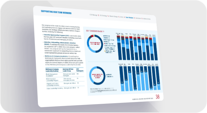 Our progress is the result of actions aimed at strengthening and expanding how we engage and advance all of our team members. Our strategic efforts provided a number of oppor - tunities, including the following: • Executive Sponsorship Program (ESP) : Launched in 2020, the two-year ESP provided valuable mentoring opportuni - ties for 15 directors and managing directors. • Selection, Onboarding, Advancement, Retention (SOAR) : To address the needs of all diverse leaders, we expanded ESP in 2022 into a new program called SOAR. This program will lay the foundation for a sustainable approach to supporting diverse talent and underrepresented groups across our enterprise. • McKinsey & Company Academies : Consulting firm McKinsey & Company’s development programs help organizations improve their talent pipeline and promote equity for diverse leaders. In 2021, American participated in four McKinsey & Company Leadership Academies. McKinsey & Company Leadership Academy American Airlines Leader Group 2021 Participants Black Management Accelerator Managers and senior managers 100 Black Executive Leadership Program Directors and managing directors 15 Hispanic and Latino Leadership Academy Managers and above 23 Asian Leadership Academy Managers and above 24 2021 TEAM MEMBER DIVERSITY 50.7% White 18.2% Black 17.4% Hispanic/Latino 6.0% Asian 3.9% Not Specified 2.1% Two or More Races 1.1% Native Hawaiian/ Other Pacific Islander 0.7% American Indian/ Alaskan Native ETHNIC COMPOSITION OF U.S. EMPLOYEES 60% Male 40% Female GENDER COMPOSITION OF EMPLOYEES GLOBALLY Note: Percentages may not add to 100% due to rounding. American’s 2021 Equal Employment Opportunity Report (EEO-1) is available on our website. AMERICAN AIRLINES ESG REPORT 2021 38 \\ Indexes & Data \\ Customers \\ Climate Change \\ Safety \\ ESG Strategy CEO Message SUPPORTING OUR TEAM MEMBERS \\ Team Members