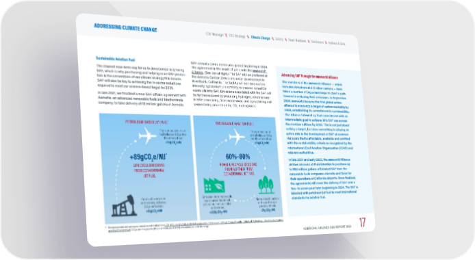 60%–80% FEWER LIFE CYCLE EMISSIONS FROM SAF THAN FROM CONVENTIONAL JET FUEL Sustainable Aviation Fuel The clearest near-term way for us to decarbonize is by using SAF, which is why purchasing and helping scale SAF produc - tion is the cornerstone of our climate strategy this decade. SAF will also be key to achieving the in-sector reductions required to meet our science-based target for 2035. In late 2021, we finalized a new SAF offtake agreement with Aemetis, an advanced renewable fuels and biochemicals company, to take delivery of 16 million gallons of Aemetis SAF annually over a seven-year period beginning in 2024. The agreement is the result of work with the one world® Alliance . (See box at right.) The SAF will be produced at the Aemetis Carbon Zero plant under development in Riverbank, California. The facility will use zero carbon intensity hydroelectric electricity to process nonedible waste oils into SAF. Emissions associated with the SAF will be further reduced by producing hydrogen, which is used in SAF processing, from waste wood and by capturing and sequestering any remaining CO 2 underground. Crude oil extraction and refining releases CO 2 e emissions +16g CO 2 e/MJ PETROLEUM-BASED JET FUEL * SUSTAINABLE AVIATION FUEL * Plants absorb carbon in the air through photosynthesis –73g CO 2 e/MJ +89gCO 2 e/MJ * LIFE CYCLE EMISSIONS FROM CONVENTIONAL JET FUEL The combustion of jet fuel releases CO 2 e into the atmosphere +73g CO 2 e/MJ The combustion of jet fuel releases CO 2 e into the atmosphere +73g CO 2 e/MJ Emissions from renewable hydrocarbon feedstock collection, transportation and refining +22.5g CO 2 e/MJ Advancing SAF Through the one world Alliance The members of the one world Alliance — which includes American and 12 other carriers — have taken a number of important steps to chart a path forward in reducing their emissions. In September 2020, one world became the first global airline alliance to announce a target of carbon neutrality by 2050, establishing its commitment to sustainability. The alliance followed up that commitment with an intermediate goal to achieve 10% SAF use across the member airlines by 2030. This is not just about setting a target, but also committing to playing an active role in the development of SAF at commer - cial scale that is affordable, available and certified with the sustainability criteria as recognized by the International Civil Aviation Organization (ICAO) and relevant authorities. In late 2021 and early 2022, the one world Alliance airlines announced their intention to purchase up to 550 million gallons of blended SAF from the renewable fuels companies Aemetis and Gevo for their operations at California airports. Once finalized, the agreements will cover the delivery of SAF over a five- to seven-year term beginning in 2024. The SAF is blended with petroleum jet fuel to meet international standards for aviation fuel. * Emissions data are averages, based on estimates from LCA of Current & Future GHG Emissions from Petroleum Jet Fuel, Massachusetts Institute of Technology Laboratory for Aviation and the Environment . CO 2 e per megajoule (MJ) is a measure of GHG emissions per unit of energy. AMERICAN AIRLINES ESG REPORT 2021 17 \\ Indexes & Data \\ Customers \\ Team Members \\ Safety \\ ESG Strategy CEO Message ADDRESSING CLIMATE CHANGE \\ Climate Change