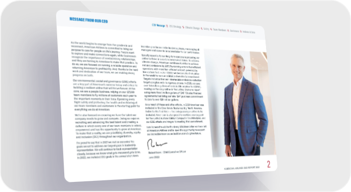 As the world begins to emerge from the pandemic and reconnect, American Airlines is committed to living our purpose to care for people on life’s journey. People want to explore and make connections again, while businesses recognize the importance of reestablishing relationships, and they are turning to American to make that possible. To do so, we are focused on running a reliable operation and returning American to profitability. And, thanks to the hard work and dedication of our team, we are making strong progress on both. Our environmental, social and governance (ESG) efforts are a key part of American’s success today and critical to building a resilient airline that will thrive forever. At the core, we are a people business, relying on our 127,000 team members to fly millions of customers each year to the important moments in their lives. Operating every flight safely and protecting the health and well-being of our team members and customers is the starting point for everything we do at American. We’re also focused on ensuring we have the talent our company needs to grow and compete. Doing so requires recruiting and advancing the best talent and creating a culture in which every one of our team members is valued, empowered and has the opportunity to grow at American. To make that a reality, we are prioritizing diversity, equity and inclusion (DEI) throughout our organization. I’m proud to say that in 2021 we met or exceeded the goals we set to address our largest gaps in leadership representation. We will continue to track representation closely, because we know what gets measured gets done. In 2022, we included DEI goals in the annual short-term incentive plan for our entire leadership team, encouraging all managers and above to be accountable for our performance. Equally essential to our long-term success is preparing our airline to thrive in a carbon-constrained future. To address climate change, American continues to strive to achieve net zero emissions by 2050 by running a more fuel-efficient operation, with more fuel-efficient aircraft, powered by low-carbon fuel. In April 2022, we became the first airline in the world to receive validation from the Science Based Targets initiative that our intermediate emissions-reduction target complies with its rigorous criteria. In 2021, we used over 1.4 million gallons of sustainable aviation fuel (SAF), making us the only airline in the United States to report using more than 1 million gallons of SAF. We also finalized agreements that bring our total SAF purchase commitment to date to over 120 million gallons. As a result of these and other efforts, in 2021 American was included in the Dow Jones Sustainability North America Index for the first time — the only passenger airline to be included. American is also proud to continue our support for the United Nations Global Compact’s Ten Principles, and our ESG efforts are integral to meeting that commitment. I am honored to add to the strong ESG foundation we have laid at American Airlines and to have the opportunity to support our incredible team as we build an even brighter future. Robert Isom | Chief Executive Officer June 2022 AMERICAN AIRLINES ESG REPORT ffff 2 \\ Indexes & Data \\ Customers \\ Team Members \\ Climate Change \\ Safety \\ ESG Strategy CEO Message MESSAGE FROM OUR CEO