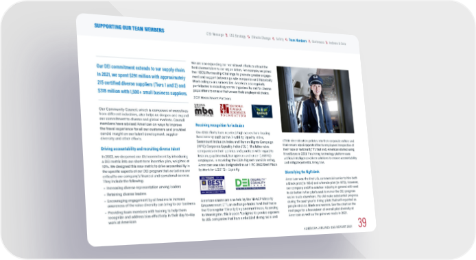 Our Community Council, which is composed of executives from different industries, also helps us deepen and expand our commitment to diverse and global markets. Council members have advised American on ways to improve the travel experience for all our customers and provided candid insight on our talent development, supplier diversity and other efforts. Driving accountability and recruiting diverse talent In 2022, we deepened our DEI commitment by introducing a DEI metric into our short-term incentive plan, weighted at 10%. We designed this new metric to drive accountability in the specific aspects of our DEI program that we believe are critical to our company’s financial and operational success. They include the following: • Increasing diverse representation among leaders • Retaining diverse leaders • Encouraging engagement by all leaders to increase awareness of the value diversity can bring to our business • Providing team members with training to help them recognize and address bias effectively in their day-to-day work at American We are also expanding our recruitment efforts to attract the best diverse talent to our organization. For example, we joined the HBCU Partnership Challenge to promote greater engage - ment and support between private companies and historically Black colleges and universities. American also regularly participates in recruiting events organized by and for diverse populations to ensure that we are their employer of choice. 2021 Recruitment Partners: Receiving recognition for inclusion Our DEI efforts have received high scores from leading benchmarks such as the Disability Equality Index, Seramount Inclusion Index and Human Rights Campaign (HRC) Corporate Equality Index (CEI). The latter rates companies on their policies and practices with regard to lesbian, gay, bisexual, transgender and queer (LGBTQ) employees. In receiving the CEI’s highest-possible rating, American was also designated as an HRC 2022 Best Place to Work for LGBTQ+ Equality. American shares are also held by the NAACP Minority Empowerment ETF, an exchange-traded fund that tracks the Morningstar Minority Empowerment Index. According to Morningstar, this index is “designed to provide exposure to U.S. companies that have embedded strong racial and ethnic diversification policies into their corporate culture and that ensure equal opportunities to employees irrespective of their race or nationality.” To that end, American started using HiredScore in 2021. This hiring technology platform uses artificial intelligence-driven solutions to ensure accountability and mitigate potential hiring bias. Diversifying the flight deck American was the first U.S. commercial carrier to hire both a Black pilot (in 1964) and a female pilot (in 1973). However, our company and the aviation industry in general still need to do better in the pilot’s seat to mirror the DEI progress we’ve made elsewhere. We did make substantial progress during the past year in hiring pilots that self-reported as people of color, Black and women. See the chart on the next page for a breakdown of overall pilot diversity at American as well as the gains we made in 2021. Our DEI commitment extends to our supply chain. In 2021, we spent $291 million with approximately 215 certified diverse suppliers (Tiers 1 and 2) and $318 million with 1,500+ small business suppliers. AMERICAN AIRLINES ESG REPORT 2021 39 \\ Indexes & Data \\ Customers \\ Climate Change \\ Safety \\ ESG Strategy CEO Message SUPPORTING OUR TEAM MEMBERS \\ Team Members