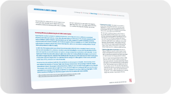 taxi operation (i.e., using just one aircraft engine to taxi to the gate after landing), which reduces the carbon emissions produced by taxiing by 20%–40%. In addition, we have implemented new procedures for staggering flight departures and arrivals, which results in less time for aircraft on the ramp and, therefore, less fuel use. • Reducing excess weight. The weight on an aircraft is a critical driver of how much fuel it uses, and even small reductions in weight can add up to significant fuel and GHG emissions savings when multiplied across our whole fleet and the many flights each aircraft makes. We have taken a number of steps to reduce weight on our aircraft, including installing lighter seats, removing seat-back entertainment systems, discontinuing American Way magazine, and stocking our galleys with only as much ice as we expect passengers will use on each flight. Even using lighter paint makes a difference: On our A321 fleet alone, this saves about 1 million gallons of fuel per year. Collectively, our weight-reduction efforts save 12.4 million gallons of fuel annually, which equals 117,800 million metric tons of CO 2 emissions avoided each year. • Optimizing flight plans and procedures. We focus on flying as efficiently as possible, which includes consid - ering everything from the speed and paths our aircraft take on departure and descent to how flight crews adjust en route to account for changing weather conditions. Since we began deploying specialized software in 2020 that uses real-time weather conditions to provide our flight crews with better data about optimal flight altitudes and speeds, we have saved more than 8.4 million gallons of fuel. That translates to just over 80,000 metric tons of CO 2 emissions avoided. This and other flight planning improvements also help us optimize the amount of arrival fuel on the aircraft — that is, the extra fuel carried on the aircraft — which makes a big difference in reducing weight and, therefore, improving fuel efficiency. Increasing Efficiency by Modernizing Our Air Traffic Control System Improving the country’s network of aviation infrastructure, technology and services will increase operational efficiency and reduce jet fuel use. In turn, that will avoid millions of metric tons of CO 2 emissions annually and help reduce aviation’s carbon footprint. Improvements in our Air Traffic Control (ATC) system will produce enormous environmental and economic benefits, and American supports efforts to modernize our ATC system. We encourage policymakers to advance policies that achieve that objective, and we are committed to working with the FAA and other policymakers to make it a reality. In 2021, the FAA implemented more efficient descent procedures that will make a meaningful impact in reducing fuel use and associated CO 2 emissions. American supported designing the new procedures by providing technical data and expertise on aircraft behavior and systems, energy management considerations and application. The new Optimized Profile Descents allow planes to glide down safely from cruising altitudes into airspace around some of the nation’s largest airports, instead of the traditional stair-step procedure that consumes more fuel. For each group of descents used at an airport, the FAA estimates that an average of 2 million gallons of fuel is saved, and 18,000 metric tons of CO 2 emissions are reduced annually. * American has also partnered with the FAA and NASA on a trial program in Charlotte, North Carolina, to test and validate the benefits of Terminal Flight Data Manager infrastructure. During testing at Charlotte Douglas International Airport, the program reduced taxi times, helping to save more than 275,000 gallons of fuel annually. The program also avoided almost eight tons of CO 2 emissions daily and cut delays by 916 hours over four years, equivalent to an average of 15 minutes of wait time on a taxiway for more than 3,600 departing flights. ** In 2021, NASA transferred findings from the trial program to the FAA for nationwide implementation. * https://www.faa.gov/newsroom/faa-implements-more-efficient-descent-procedures-reduce-fuel-burn-emissions . ** https://www.nasa.gov/press-release/nasa-transfers-air-traffic-management-tool-updates-to-faa. AMERICAN AIRLINES ESG REPORT 2021 16 \\ Indexes & Data \\ Customers \\ Team Members \\ Safety \\ ESG Strategy CEO Message ADDRESSING CLIMATE CHANGE \\ Climate Change