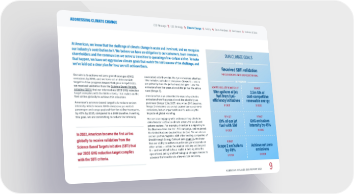 At American, we know that the challenge of climate change is acute and imminent, and we recognize our industry’s contribution to it. We believe we have an obligation to our customers, team members, shareholders and the communities we serve to transition to operating a low-carbon airline. To make that happen, we have set aggressive climate goals that match the seriousness of the challenge, and we’ve laid out a clear plan for how we will achieve them. Our aim is to achieve net zero greenhouse gas (GHG) emissions by 2050, and we have set an intermediate target to drive progress toward that goal. In April 2022, we received validation from the Science Based Targets initiative (SBTi) that our intermediate 2035 GHG reduction target complies with the SBTi criteria. That makes us the first airline globally to achieve this milestone. American’s science-based target is to reduce carbon intensity, which means GHG emissions per unit of passenger and cargo payload that the airline transports, by 45% by 2035, compared to a 2019 baseline. In setting this goal, we are committing to reduce the intensity associated with the entire life cycle emissions of jet fuel. This includes both direct emissions (Scope 1) — which are primarily from the jet fuel used in flight — and the emissions from the production of the jet fuel the airline uses (Scope 3). American has also committed to reduce by 40% the emissions from the production of the electricity we purchase (Scope 2) by 2035, also with a 2019 baseline. Scope 2 emissions are a small part of our overall GHG emissions, but an important focus for reducing the impacts of global warming. We are also engaging with and supporting efforts to drive broader action on climate across the public and private sectors. For example, American is a signatory to the Business Ambition for 1.5°C campaign, and we joined the United Nations-backed Race to Zero. We are also an anchor partner, together with other leading companies, of Breakthrough Energy Catalyst (see page 13). We know that our ability to achieve our climate goals depends on other actors — within the aviation industry and beyond it — and we intend to be a leader in helping drive the operational, policy and technological changes needed to advance the transition to a low-carbon economy. OUR CLIMATE GOALS ACHIEVED IN PROGRESS Achieve net zero emissions BY 2050 REDUCE Scope 2 emissions by 40% BY 2035 ACHIEVE ABSOLUTE REDUCTION OF 50m gallons of jet fuel from fuel- efficiency initiatives BY 2025 REPLACE 10% of our jet fuel with SAF BY 2030 REDUCE GHG emissions intensity by 45% BY 2035 SOURCE 2.5m GJs of cost-competitive renewable energy BY 2025 Received SBTi validation FOR OUR 2035 GHG EMISSIONS REDUCTION GOAL In 2022, American became the first airline globally to receive validation from the Science Based Targets initiative (SBTi) that our 2035 GHG reduction target complies with the SBTi criteria. AMERICAN AIRLINES ESG REPORT 2021 9 \\ Indexes & Data \\ Customers \\ Team Members \\ Safety \\ ESG Strategy CEO Message ADDRESSING CLIMATE CHANGE \\ Climate Change