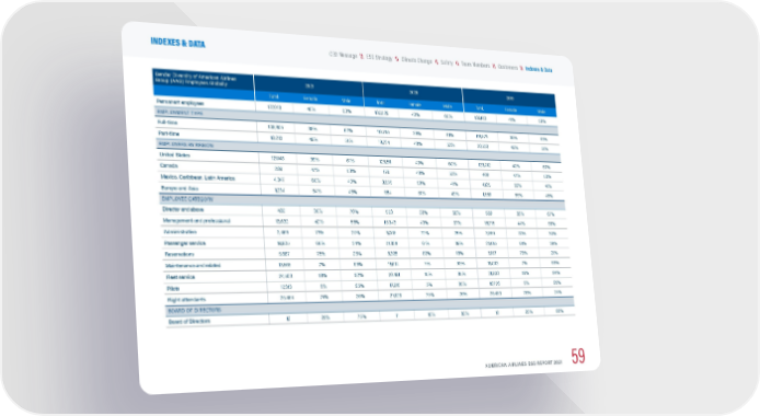 Gender Diversity of American Airlines Group (AAG) Employees Globally 2021 2020 2019 Total Female Male Total Female Male Total Female Male Permanent employees 127,018 40% 60% 130,529 40% 60% 139,103 41% 59% EMPLOYMENT TYPE Full-time 108,805 38% 62% 110,795 39% 61% 118,573 39% 61% Part-time 18,213 49% 51% 19,734 48% 52% 20,530 49% 51% EMPLOYEES BY REGION United States 121,148 39% 61% 125,811 40% 60% 133,012 40% 60% Canada 289 47% 53% 179 48% 52% 408 47% 53% Mexico, Caribbean, Latin America 4,347 60% 40% 3,555 59% 41% 4,125 59% 41% Europe and Asia 1,234 54% 46% 984 51% 49% 1,558 55% 45% EMPLOYEE CATEGORY Director and above 480 30% 70% 563 32% 68% 589 33% 67% Management and professional 13,632 42% 58% 15,343 43% 57% 16,715 44% 56% Administrative 2,469 73% 27% 3,008 72% 28% 3,955 70% 30% Passenger service 19,905 66% 34% 21,338 61% 39% 23,615 61% 39% Reservations 5,687 75% 25% 5,328 82% 18% 5,157 79% 21% Maintenance and related 17,565 7% 93% 18,614 7% 93% 19,003 7% 93% Fleet service 24,503 18% 82% 20,491 15% 85% 21,800 16% 84% Pilots 17,313 5% 95% 17,915 5% 95% 18,776 5% 95% Flight attendants 25,464 74% 26% 27,929 75% 25% 29,493 76% 24% BOARD OF DIRECTORS Board of Directors 12 25% 75% 11 18% 82% 10 20% 80% AMERICAN AIRLINES ESG REPORT 2021 59 \\ Customers \\ Team Members \\ Climate Change \\ Safety \\ ESG Strategy CEO Message INDEXES & DATA \\ Indexes & Data