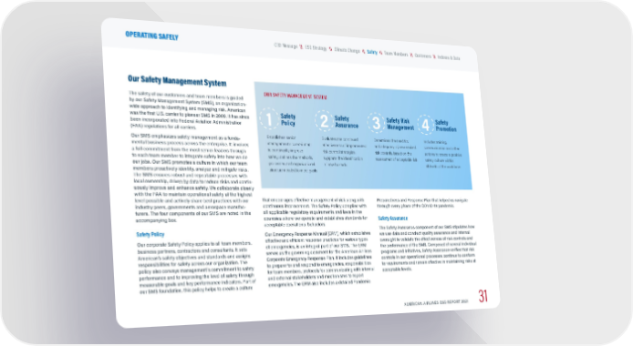Our Safety Management System The safety of our customers and team members is guided by our Safety Management System (SMS), an organization- wide approach to identifying and managing risk. American was the first U.S. carrier to pioneer SMS in 2009. It has since been incorporated into Federal Aviation Administration (FAA) regulations for all carriers. Our SMS emphasizes safety management as a funda - mental business process across the enterprise. It involves a full commitment from the most senior leaders through to each team member to integrate safety into how we do our jobs. Our SMS promotes a culture in which our team members proactively identify, analyze and mitigate risks. The SMS ensures robust and repeatable processes with local ownership, driven by data to reduce risks and contin - uously improve and enhance safety. We collaborate closely with the FAA to maintain operational safety at the highest level possible and actively share best practices with our industry peers, governments and aerospace manufac - turers. The four components of our SMS are noted in the accompanying box. Safety Policy Our corporate Safety Policy applies to all team members, business partners, contractors and consultants. It sets American’s safety objectives and standards and assigns responsibilities for safety across our organization. The policy also conveys management’s commitment to safety performance and to improving the level of safety through measurable goals and key performance indicators. Part of our SMS foundation, this policy helps to create a culture that encourages effective management of risk along with continuous improvement. The Safety Policy complies with all applicable regulatory requirements and laws in the countries where we operate and establishes standards for acceptable operational behaviors. Our Emergency Response Manual (ERM), which establishes effective and efficient response practices for various types of emergencies, is an integral part of our SMS. The ERM serves as the governing document for the American Airlines Corporate Emergency Response Plan. It includes guidelines to prepare for and respond to emergencies, responsibilities for team members, protocols for communicating with internal and external stakeholders and mechanisms to report emergencies. The ERM also includes a detailed Pandemic Preparedness and Response Plan that helped us navigate through every phase of the COVID-19 pandemic. Safety Assurance The Safety Assurance component of our SMS stipulates how we use data and conduct quality assurance and internal oversight to validate the effectiveness of risk controls and the performance of the SMS. Composed of several individual programs and initiatives, Safety Assurance verifies that risk controls in our operational processes continue to conform to requirements and remain effective in maintaining risks at acceptable levels. OUR SAFETY MANAGEMENT SYSTEM Establishes senior management’s commitment to continually improve safety; defines the methods, processes and organizational structure needed to meet goals Evaluates the continued effectiveness of implemented risk control strategies; supports the identification of new hazards Determines the need for, and adequacy of, new revised risk controls, based on the assessment of acceptable risk Includes training, communication and other actions to create a positive safety culture within all levels of the workforce 1 Safety Policy 2 Safety Assurance 3 Safety Risk Management 4 Safety Promotion AMERICAN AIRLINES ESG REPORT 2021 31 \\ Indexes & Data \\ Customers \\ Team Members \\ Climate Change \\ ESG Strategy CEO Message OPERATING SAFELY \\ Safety