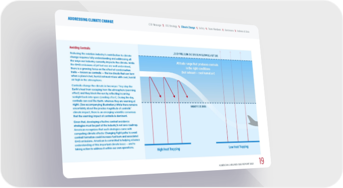 Avoiding Contrails Reducing the aviation industry’s contribution to climate change requires fully understanding and addressing all the ways our industry currently impacts the climate. While the GHG emissions of jet fuel use are well understood, there is a growing focus on the effect of condensation trails — known as contrails — the ice clouds that can form when a plane’s hot, humid exhaust mixes with cool, humid air high in the atmosphere. Contrails change the climate in two ways: They stop the Earth’s heat from escaping from the atmosphere (warming effect) and they block the sun by reflecting incoming sunlight back into space (cooling effect). During the day, contrails can cool the Earth, whereas they are warming at night. (See accompanying illustration.) While there remains uncertainty about the precise magnitude of contrails’ climate impact, there is an emerging scientific consensus that the warming impact of contrails is dominant. Given that, developing effective contrail avoidance strategies must be part of the industry’s net zero roadmap. American recognizes that such strategies come with competing climate effects: Changing flight paths to avoid contrail formation could increase fuel burn and associated GHG emissions. American is committed to helping advance understanding of this important climate issue — and to taking action to address it within our own operations. LOWER FUEL BURN AND MAXIMUM ALLOWABLE ALTITUDE HIGHER FUEL BURN High Heat Trapping Altitude range that produces contrails in the right conditions (hot exhaust + cool humid air) Low Heat Trapping AMERICAN AIRLINES ESG REPORT 2021 19 \\ Indexes & Data \\ Customers \\ Team Members \\ Safety \\ ESG Strategy CEO Message ADDRESSING CLIMATE CHANGE \\ Climate Change